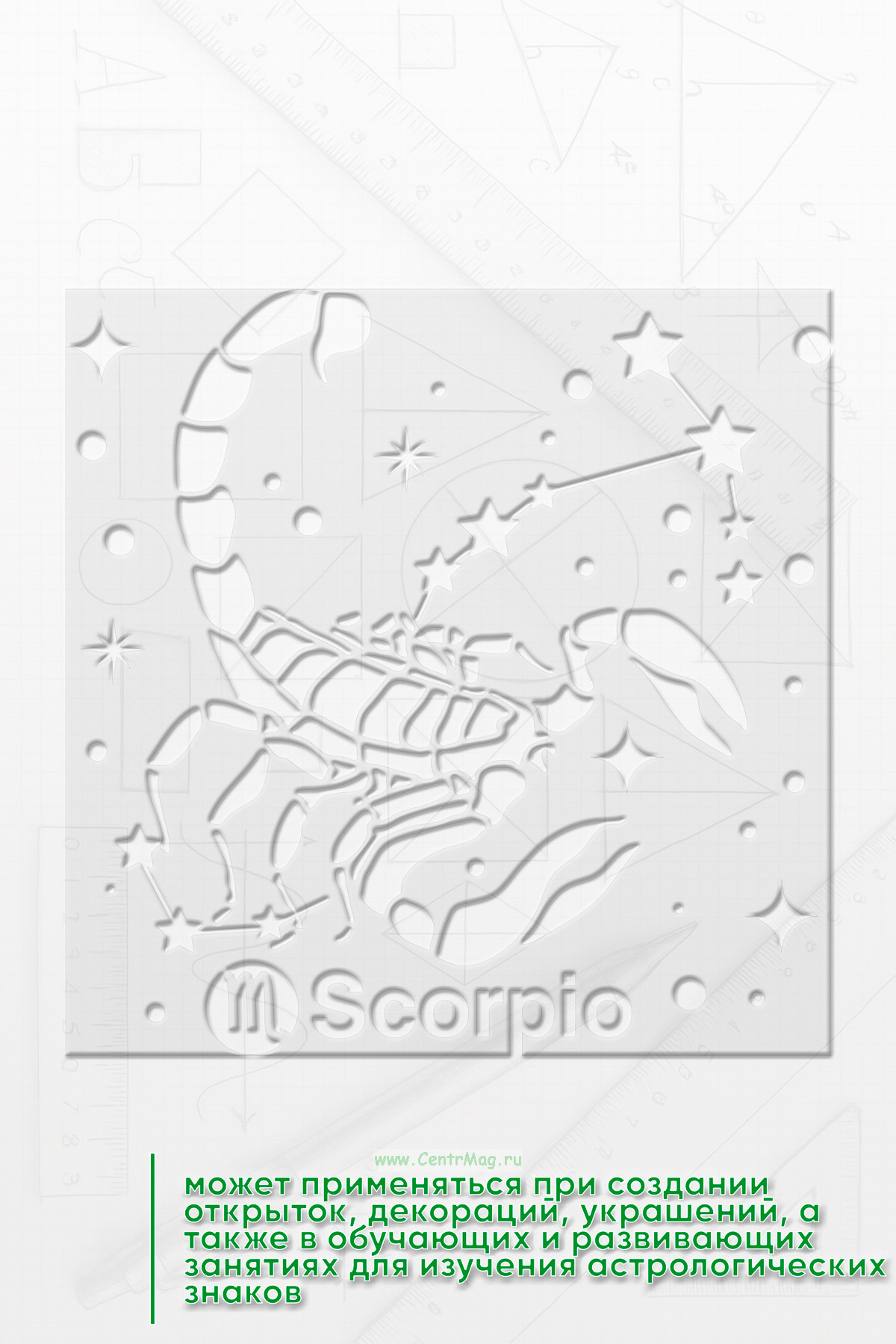 Трафарет "Знаки зодиака Scorpio" предназначен для использования в декоративных и художественных работах. Он позволяет легко и точно наносить изображения знаков зодиака на различные поверхности, такие как бумага, ткань, стены или другие материалы. Такой трафарет может применяться при создании открыток, декораций, украшений, а также в обучающих и развивающих занятиях для изучения астрологических знаков.