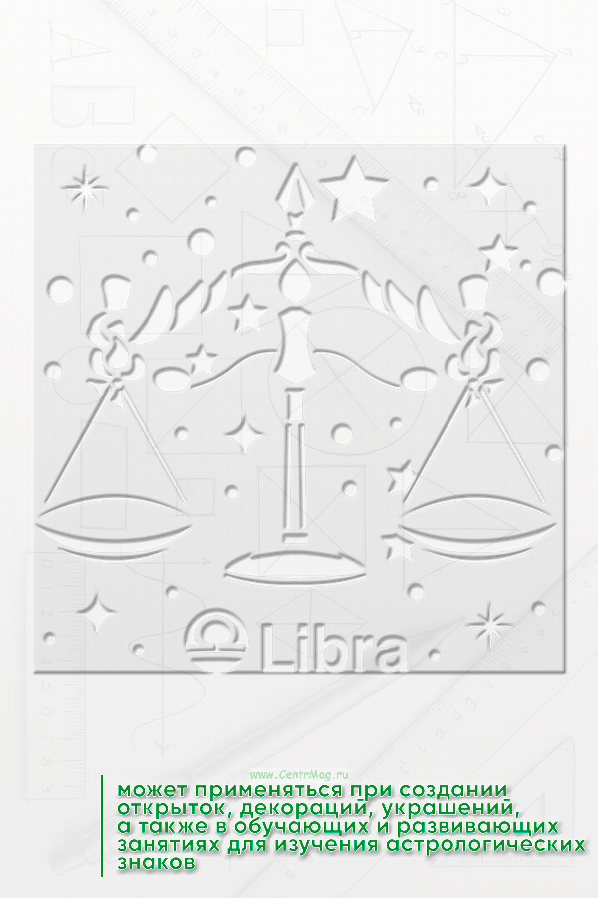 Трафарет "Знаки зодиака Libra" предназначен для использования в декоративных и художественных работах. Он позволяет легко и точно наносить изображения знаков зодиака на различные поверхности, такие как бумага, ткань, стены или другие материалы. Такой трафарет может применяться при создании открыток, декораций, украшений, а также в обучающих и развивающих занятиях для изучения астрологических знаков.