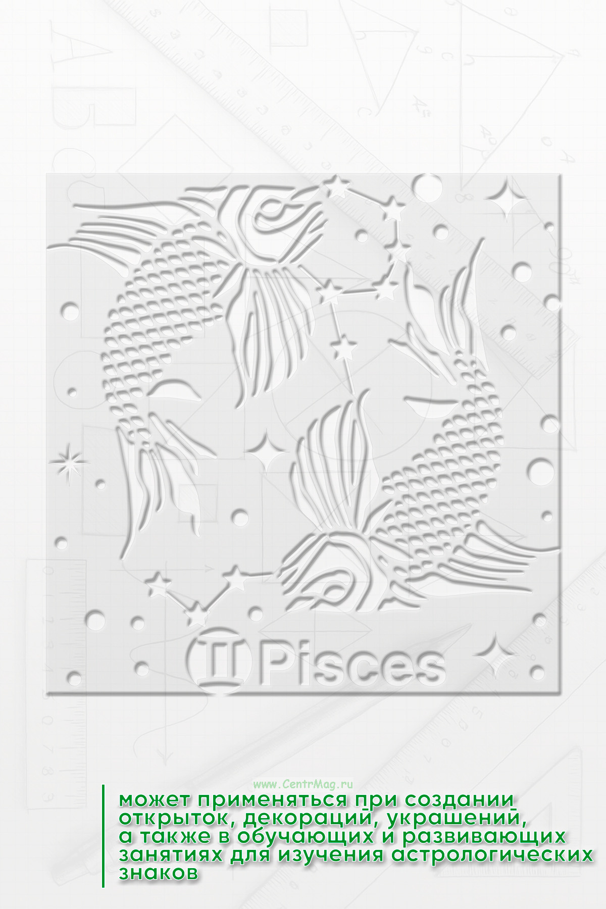 Трафарет "Знаки зодиака Pisces" предназначен для использования в декоративных и художественных работах. Он позволяет легко и точно наносить изображения знаков зодиака на различные поверхности, такие как бумага, ткань, стены или другие материалы. Такой трафарет может применяться при создании открыток, декораций, украшений, а также в обучающих и развивающих занятиях для изучения астрологических знаков.