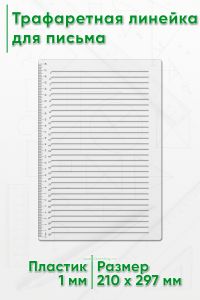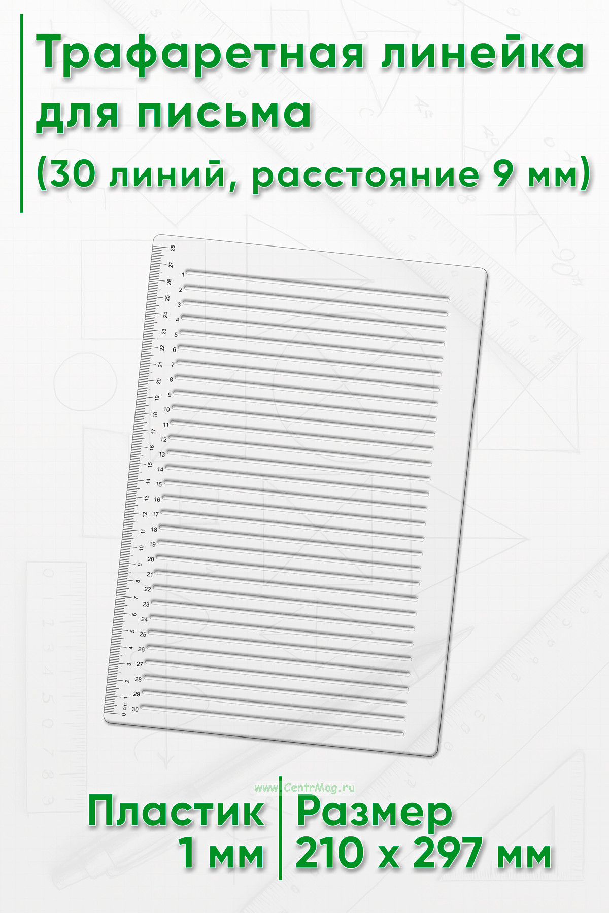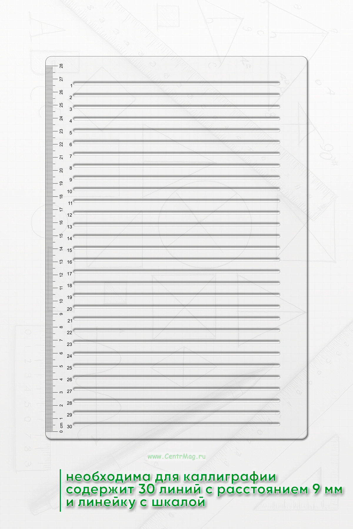 Трафаретная линейка для письма, гибкая, прозрачная. Необходима для каллиграфии. Содержит 30 линий с расстоянием 9 мм и линейку с шкалой.