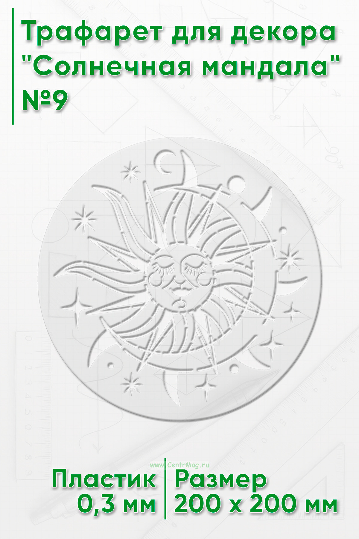 Трафарет для декора "Солнечная мандала" предназначен для создания красивых и гармоничных декоративных элементов на различных поверхностях с помощью нанесения рисунка в виде солнечной мандалы.