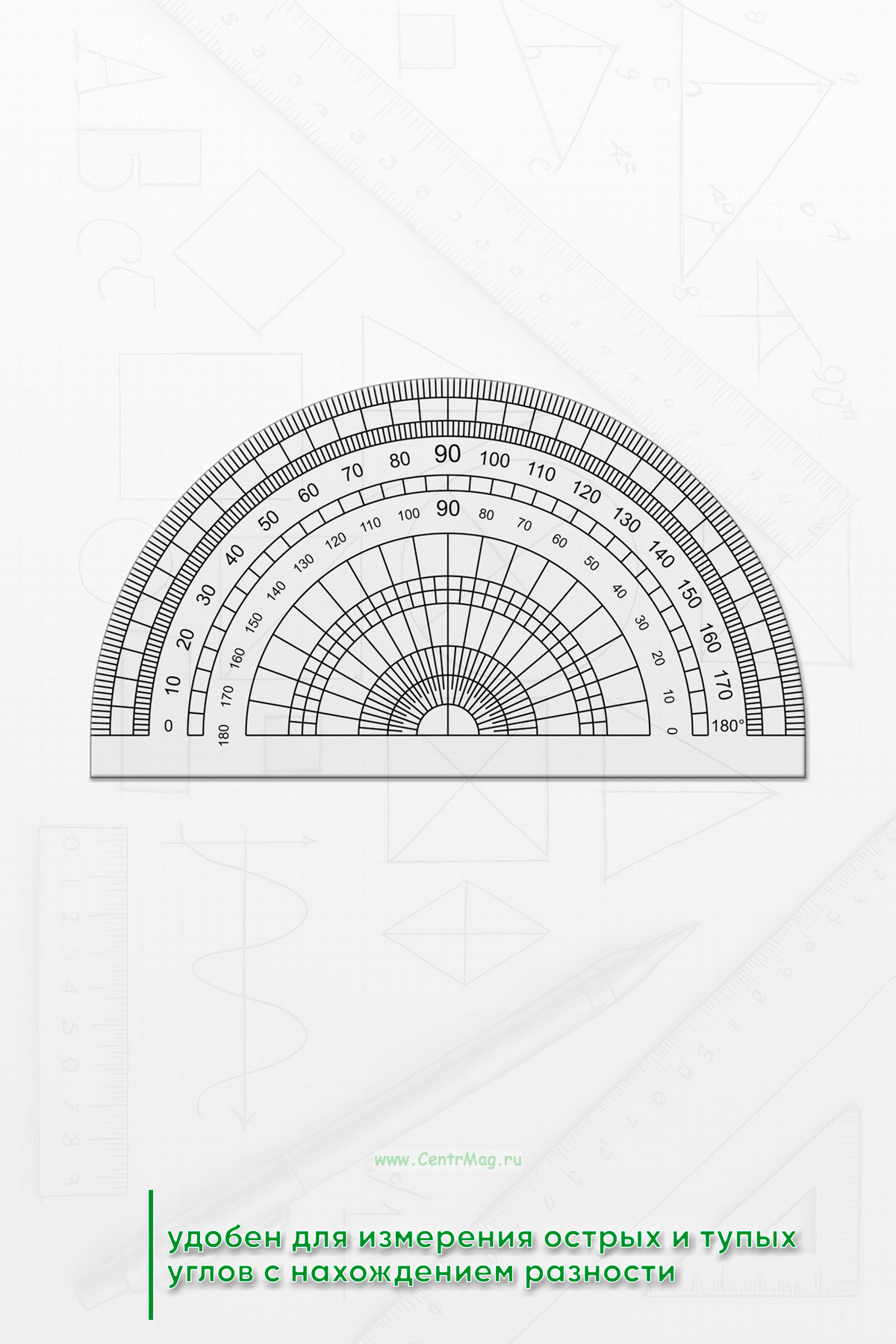 Транспортир с дополнительной разметкой — это транспортир, на котором помимо стандартных градусных делений, нанесены дополнительные линии, метки или шкалы, упрощающие выполнение определённых задач, удобен для измерения острых и тупых углов с нахождением разности.