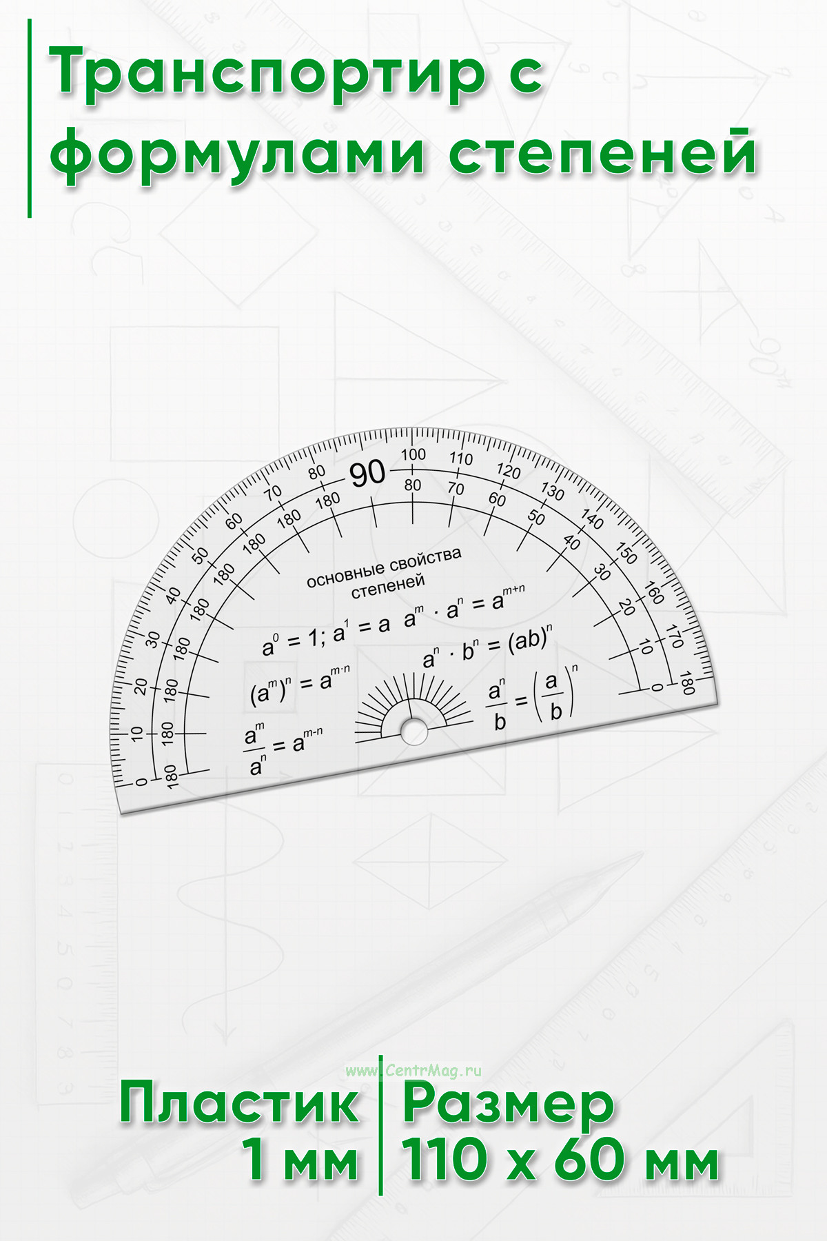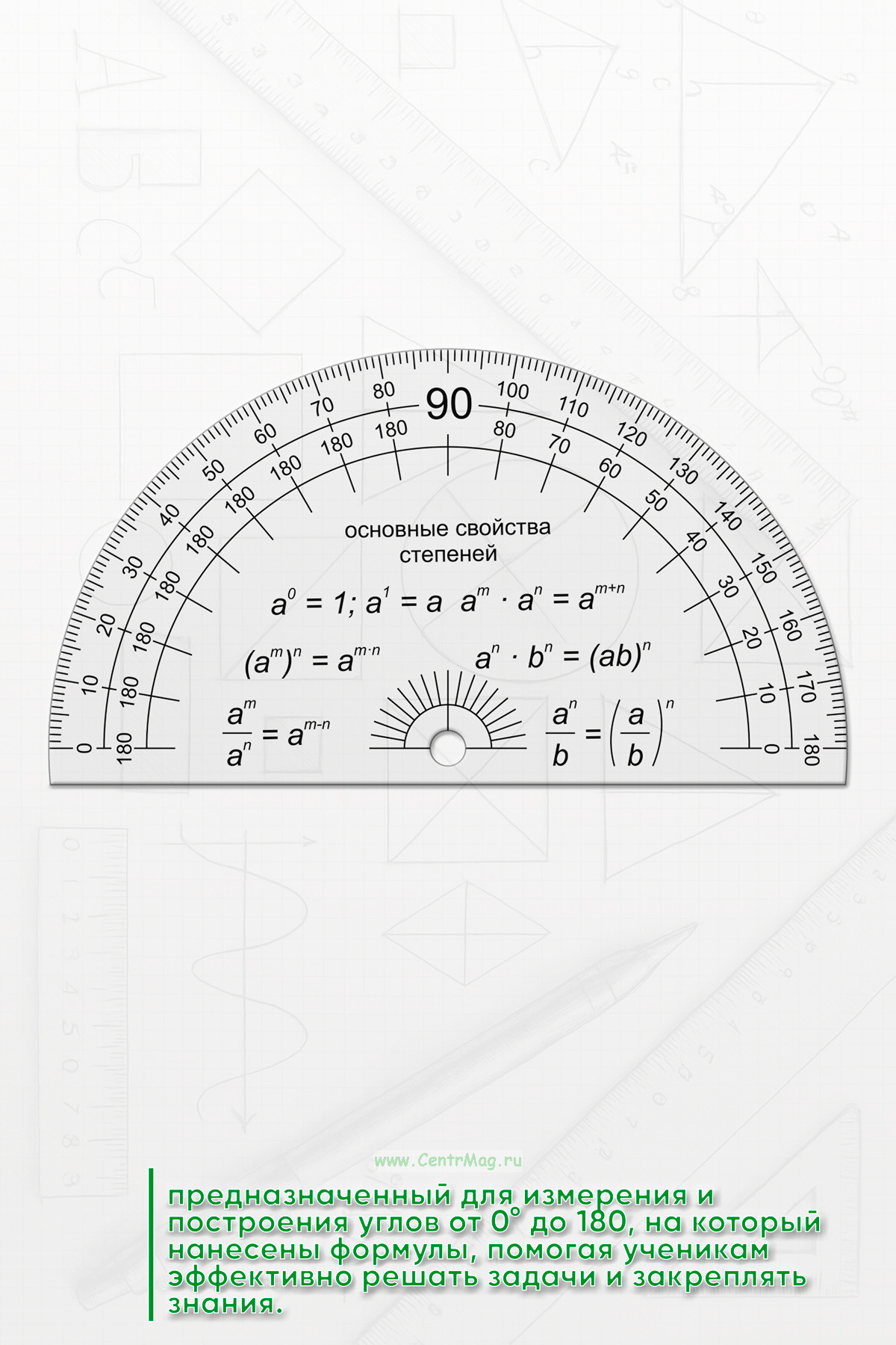 Транспортир с формулами степеней — это инструмент, предназначенный для измерения и построения углов от 0° до 180, на который нанесены формулы, помогая ученикам эффективно решать задачи и закреплять знания.