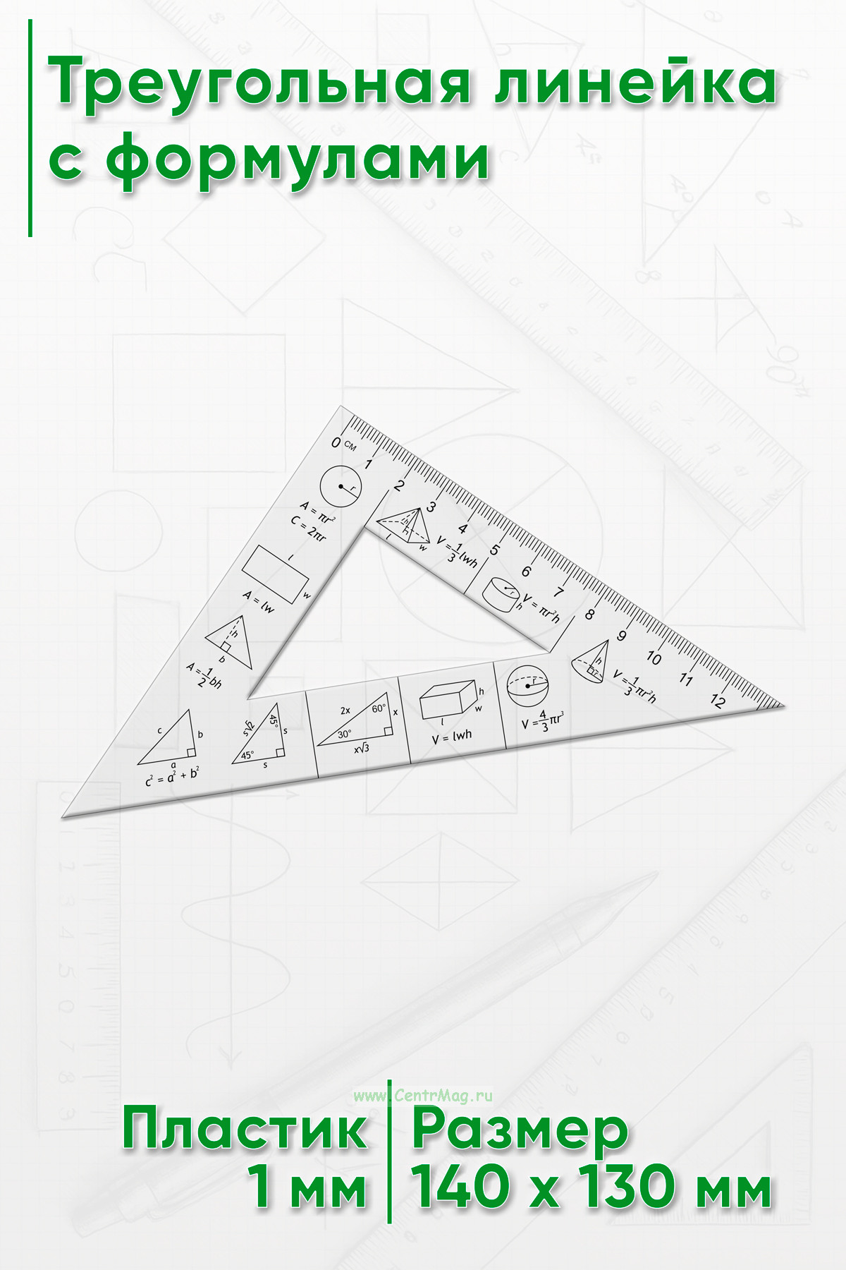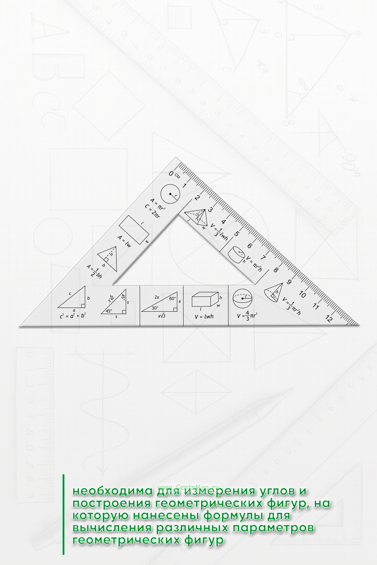 Линейка необходима для измерения углов и построения геометрических фигур, на которую нанесены формулы для вычисления различных параметров геометрических фигур, помогая ученикам эффективно решать задачи и закреплять знания.