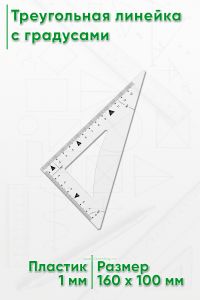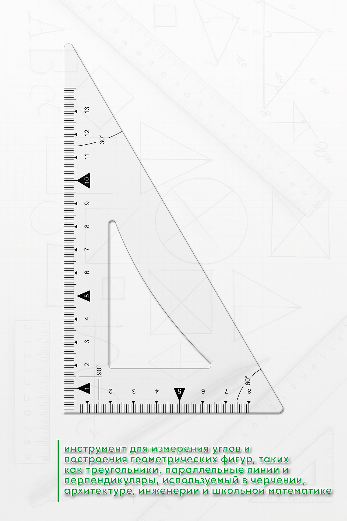 Треугольная линейка с градусами — это инструмент для измерения углов и построения геометрических фигур, таких как треугольники, параллельные линии и перпендикуляры, используемый в черчении, архитектуре, инженерии и школьной математике.