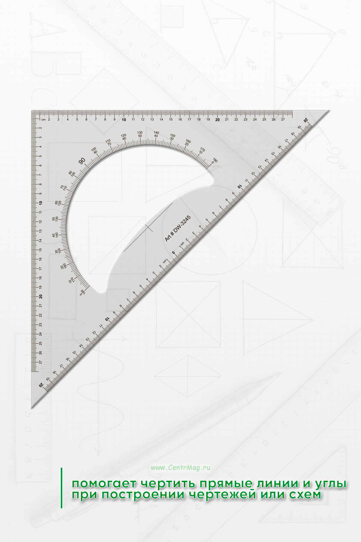 Треугольник с транспортиром помогает чертить прямые линии и углы при построении чертежей или схем.