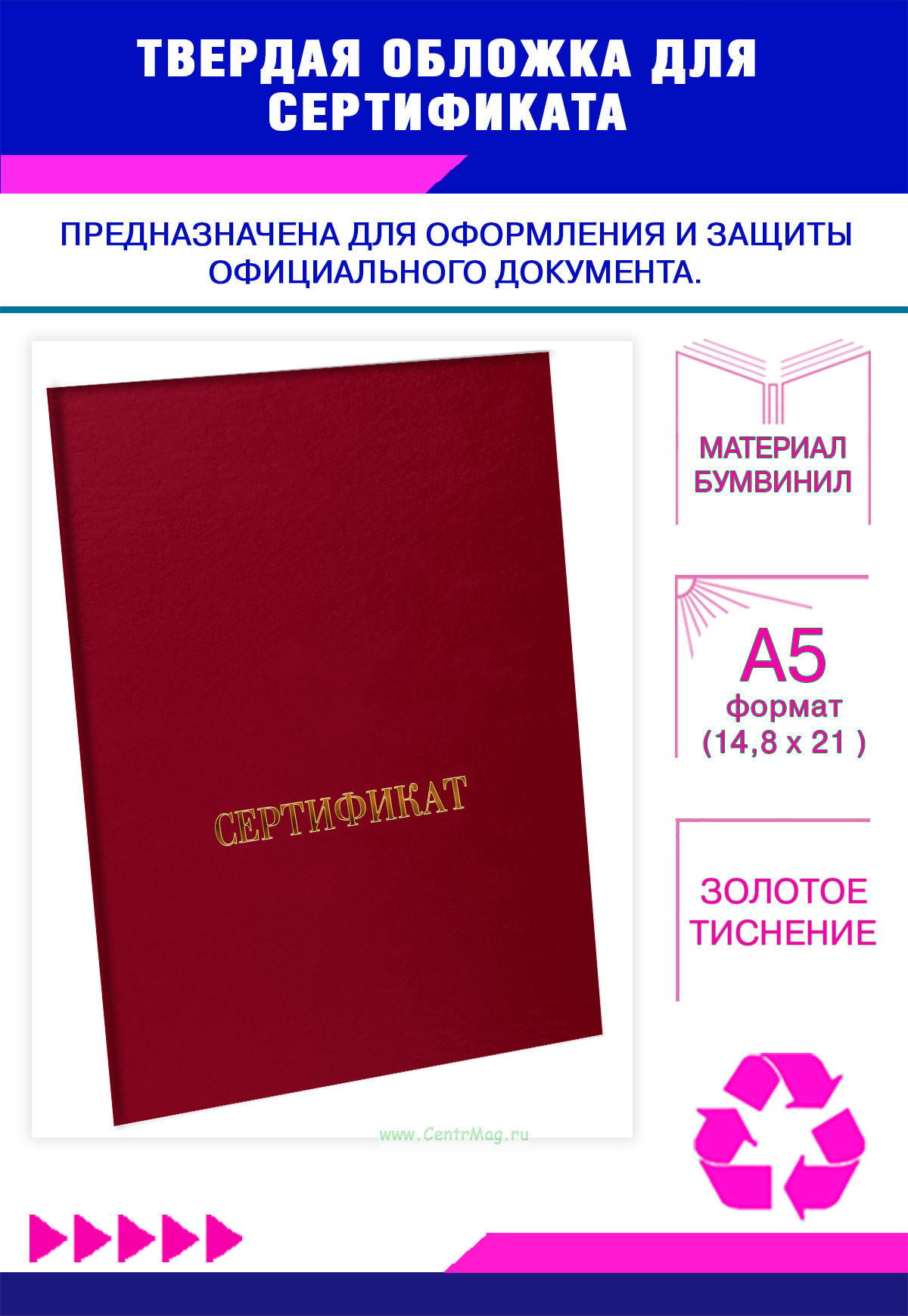 Твердая обложка для сертификата формата А5, выполненная из бумвинила, с золотым тиснением. Предназначена для защиты и оформления официальных документов. Подчёркивает официальный статус. Подходит для торжественного вручения и длительного хранения.