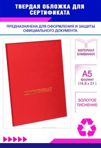 Твердая обложка для сертификата формата А5, выполненная из бумвинила, с золотым тиснением. Предназначена для защиты и оформления официальных документов. Подчёркивает официальный статус. Подходит для торжественного вручения и длительного хранения.