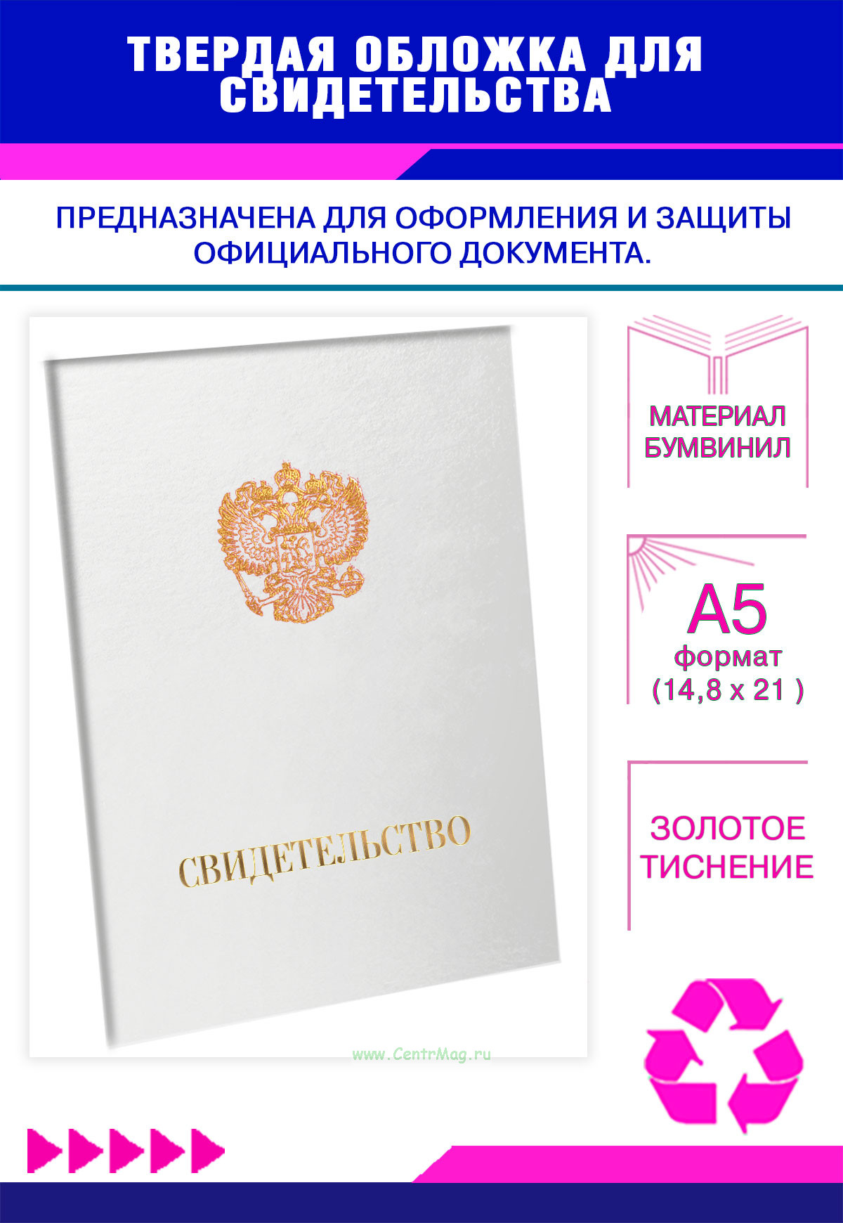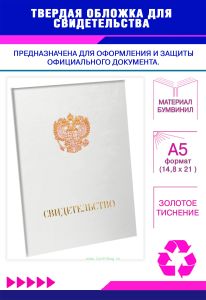 Твердая обложка для свидетельства формата А5, выполненная из бумвинила, с золотым тиснением. Предназначена для защиты и оформления официальных документов. Придает свидетельству презентабельный и торжественный вид.