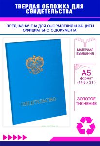 Твердая обложка для свидетельства формата А5, выполненная из бумвинила, с золотым тиснением. Предназначена для защиты и оформления официальных документов. Придает свидетельству презентабельный и торжественный вид.