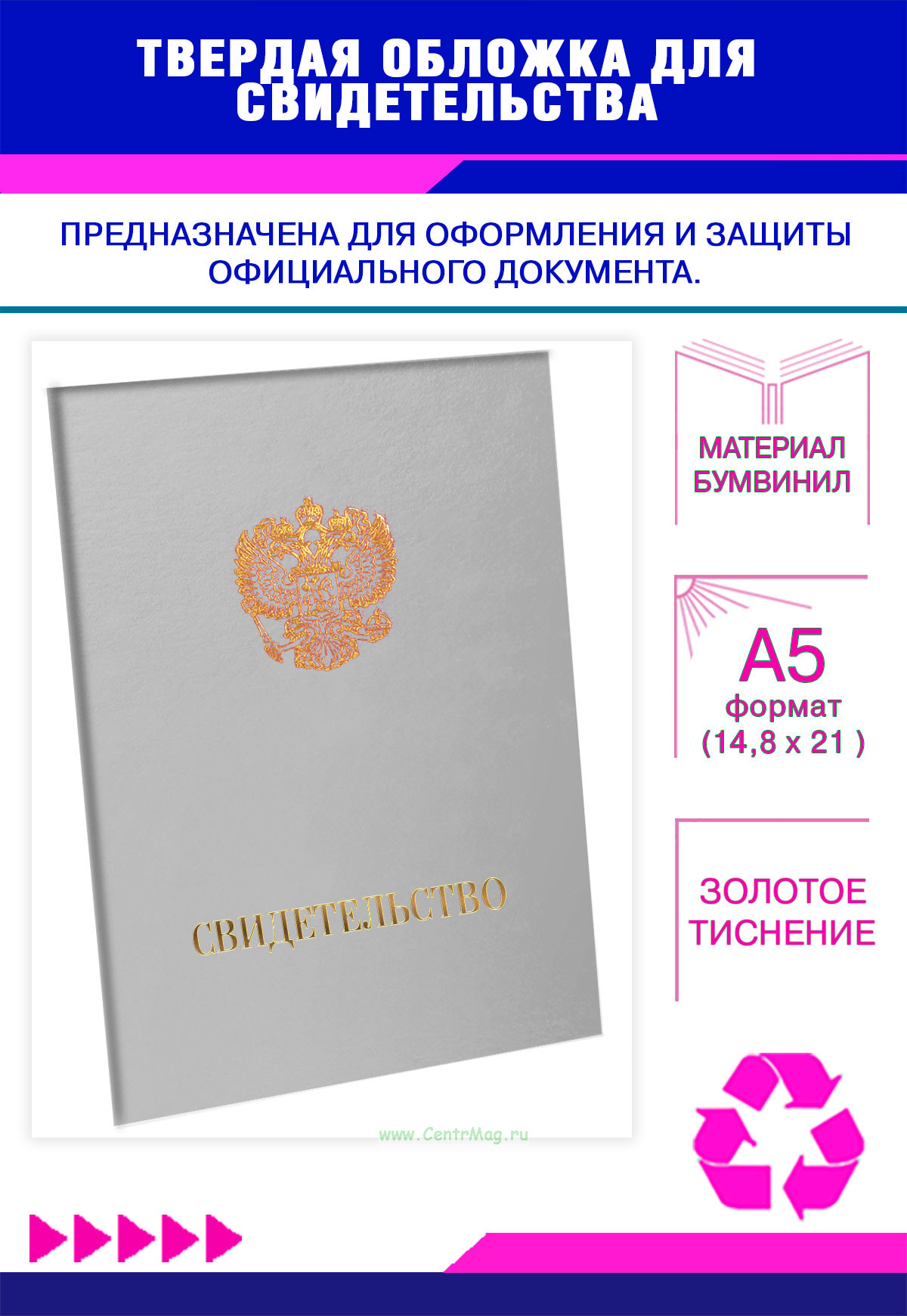 Твердая обложка для свидетельства формата А5, выполненная из бумвинила, с золотым тиснением. Предназначена для защиты и оформления официальных документов. Придает свидетельству презентабельный и торжественный вид.