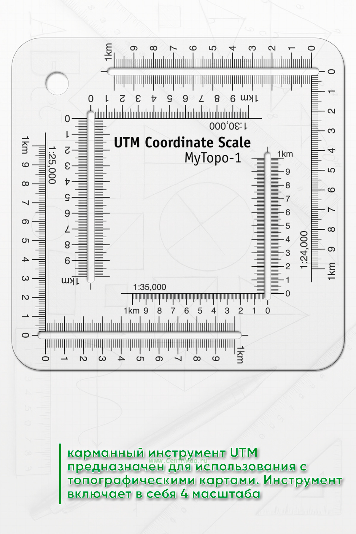 Этот карманный инструмент UTM предназначен для использования с топографическими картами. Инструмент включает в себя 4 масштаба, предлагаемых для топографических карт. Этот карманный UTM-инструмент предназначен для использования с аэрофотоснимками.