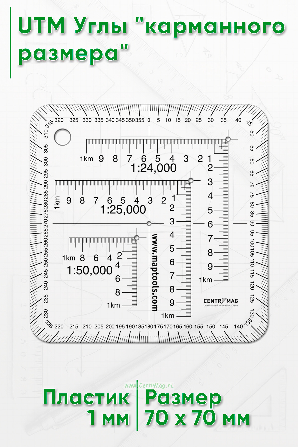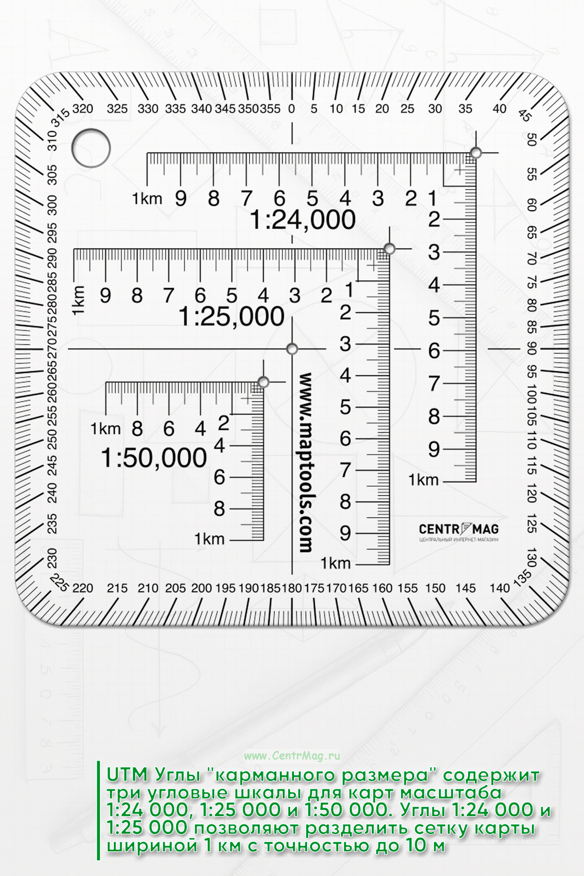 UTM Углы "карманного размера" содержит три угловые шкалы для карт масштаба 1:24 000, 1:25 000 и 1:50 000. Углы 1:24 000 и 1:25 000 позволяют разделить сетку карты шириной 1 км с точностью до 10 м. Угол 1:50 000 позволяет разделить сетку карты шириной 1 км с точностью до 20 м.