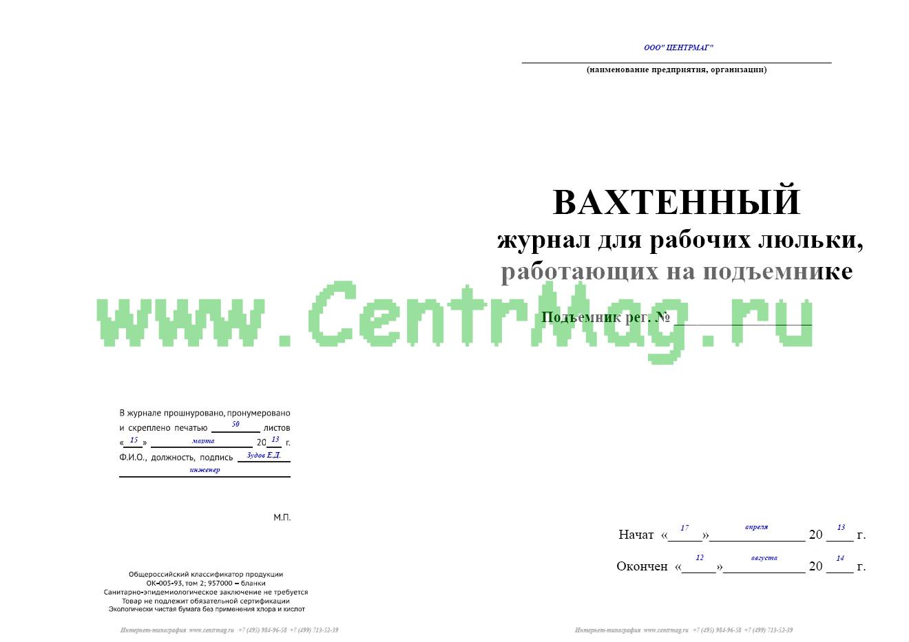 Форма вахтенного журнала для рабочих люльки, работающих на подъемнике соответвует Приложению к Типовой инструкции по безопасному ведению работ для рабочих люльки, находящихся на подъемнике (вышке). ТИ 36-22-22-03 (утв. "ВКТИмонтажстроймеханизация" 05.11.2003), Приложению 5 к Правилам устройства и безопасной эксплуатации строительных подъемников (ПБ 10-518-02), а также Типовой инструкции по безопасному ведению работ для рабочих люльки, находящихся на подъемнике (вышке) и Федеральным нормам и правилам в области промышленной безопасности «Правила безопасности опасных производственных объектов, на которых используются подъемные сооружения». РД 10-198-98 (утв. Постановлением Госгортехнадзора РФ от 02.04.1998 N 21).
