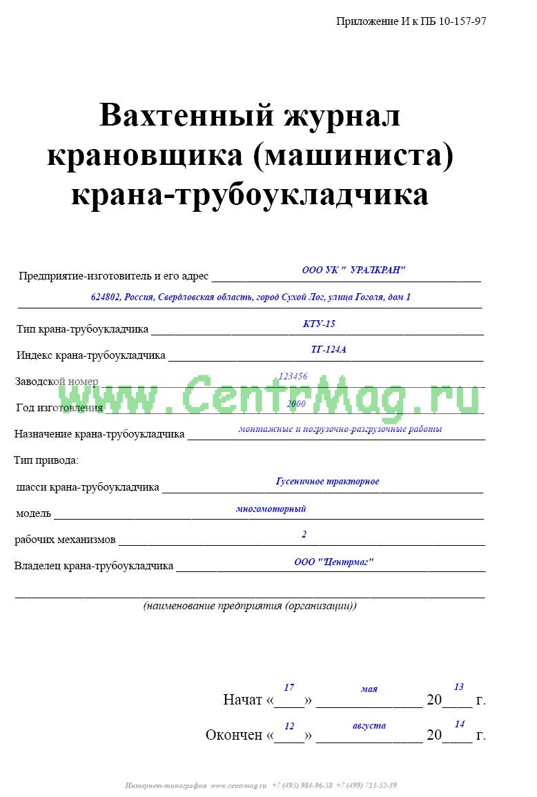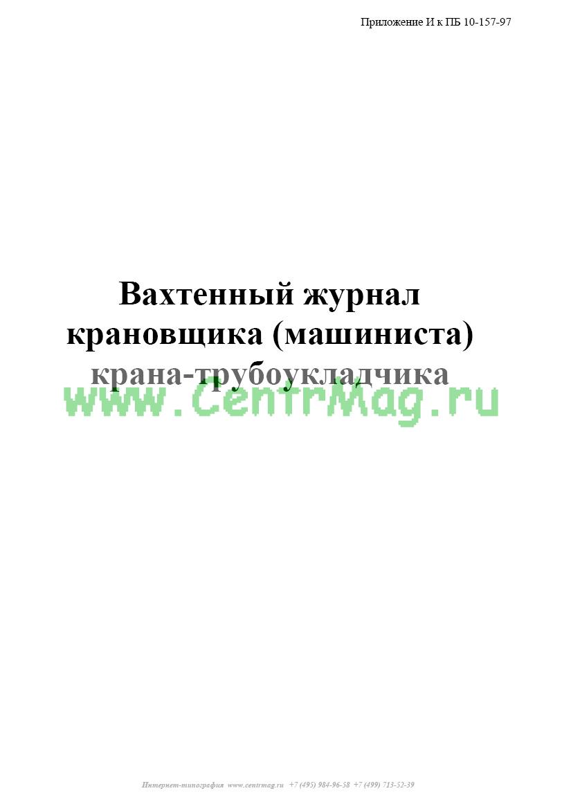 Форма Вахтенного журнала крановщика (машиниста) крана-трубоукладчика соответствует Приложению 9, которое утверждено Постановлением Госгортехнадзора России ПБ 10-157-97 № 44 «Правила устройства и безопасной эксплуатации кранов-трубоукладчиков» от 20.11.97. Оно не действует, т.к. в него были внесены изменения, утвержденные и введенные в действие с 28.10.2008 Приказом ростехнадзора от 28 октября 2008 года № 849-а «О внесении изменений в Правила устройства и безопасной эксплуатации кранов-трубоукладчиков, Правила устройства и безопасной эксплуатации грузоподъемных кранов».