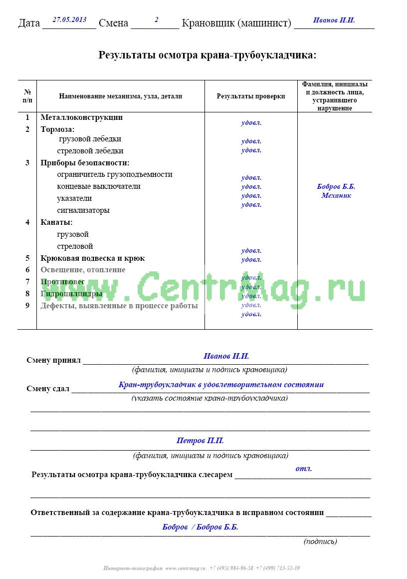 Вахтенный журнал крановщика (машиниста) крана-трубоукладчика имеет графы: