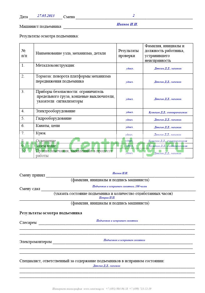 Специалист, ответственный за содержание подъемников в исправном состоянии, должен установить такой порядок, чтобы лица, на которых возложены обязанности по обслуживанию подъемников (машинисты, слесари, электромонтеры, наладчики приборов безопасности), вели наблюдение за порученным им оборудованием путем осмотра и проверки его работоспособности и поддерживали его в исправном состоянии. Машинисты должны производить осмотр подъемников перед началом работы, для чего им должно быть выделено соответствующее время. Результаты осмотра и проверки подъемника должны записываться в вахтенный журнал.