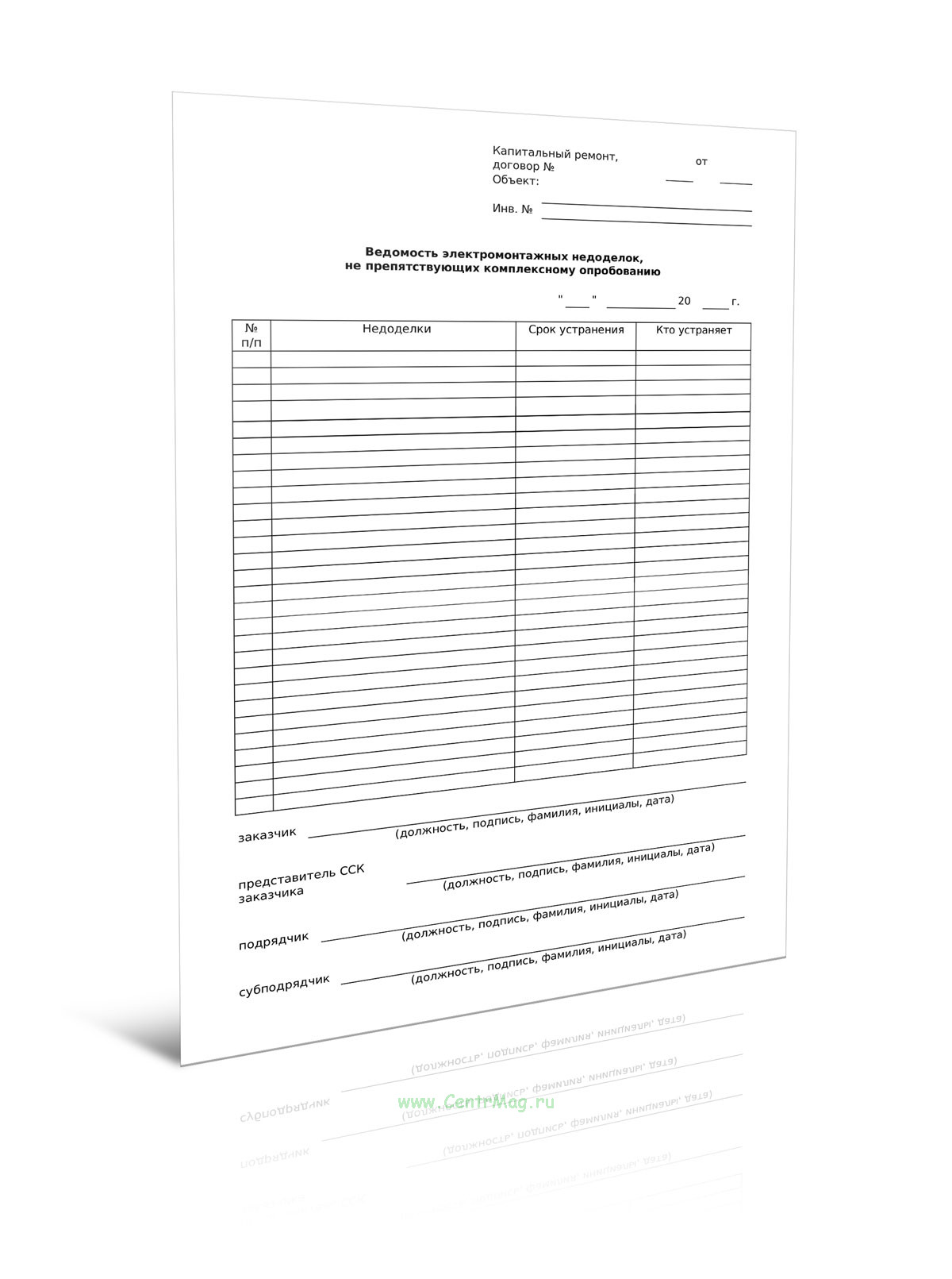 Ведомость электромонтажных недоделок, не препятствующих комплексному опробованию (Форма Д.39) продается только как чистый незаполненный бланк, без печатей и подписей соответствует 149-ФЗ от 27.07.2006
