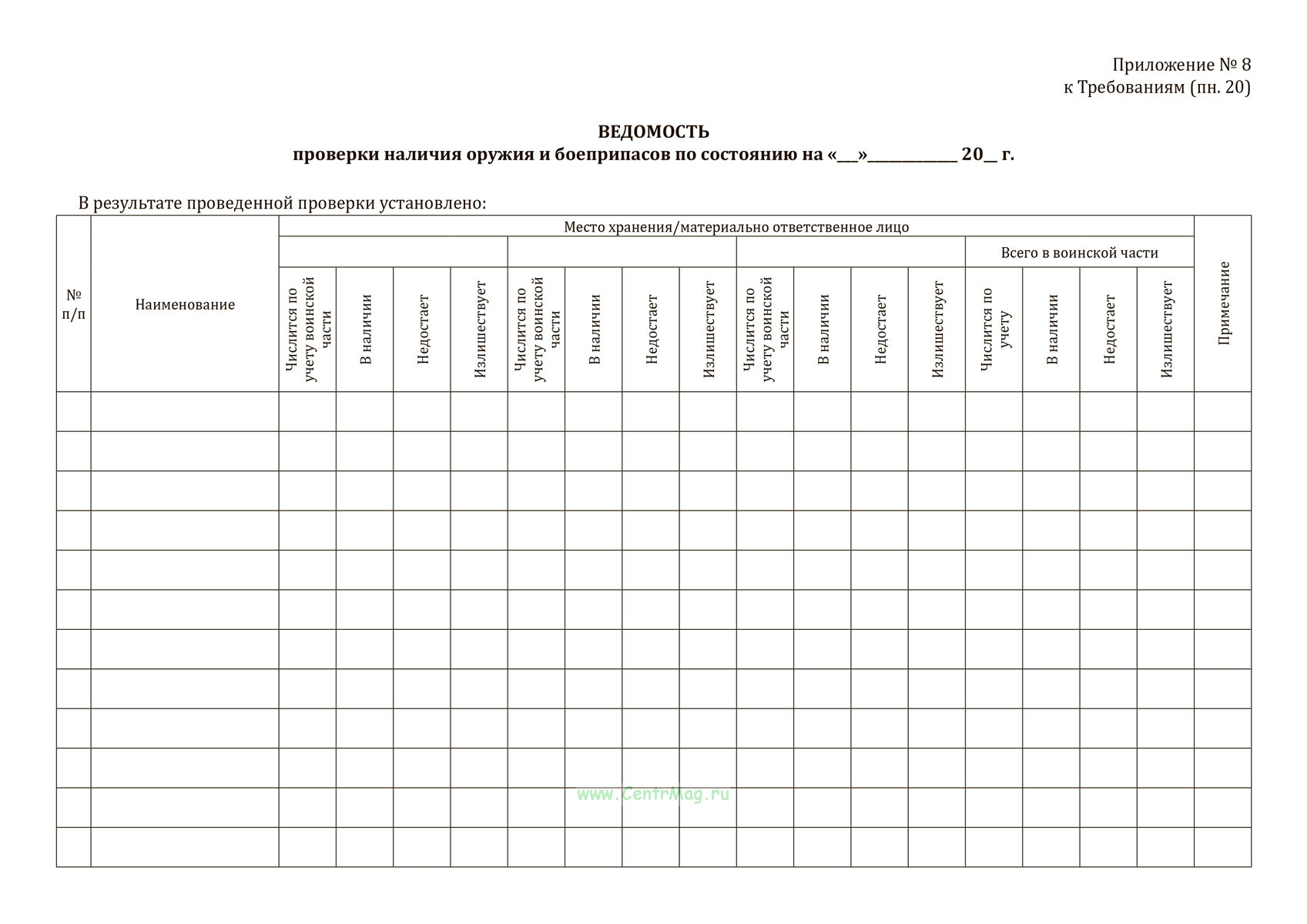 Форма Ведомости проверки наличия оружия и боеприпасов соответствует Приложению 8 к Приказу Министра обороны РФ от 8 июля 2020 г. N 299.