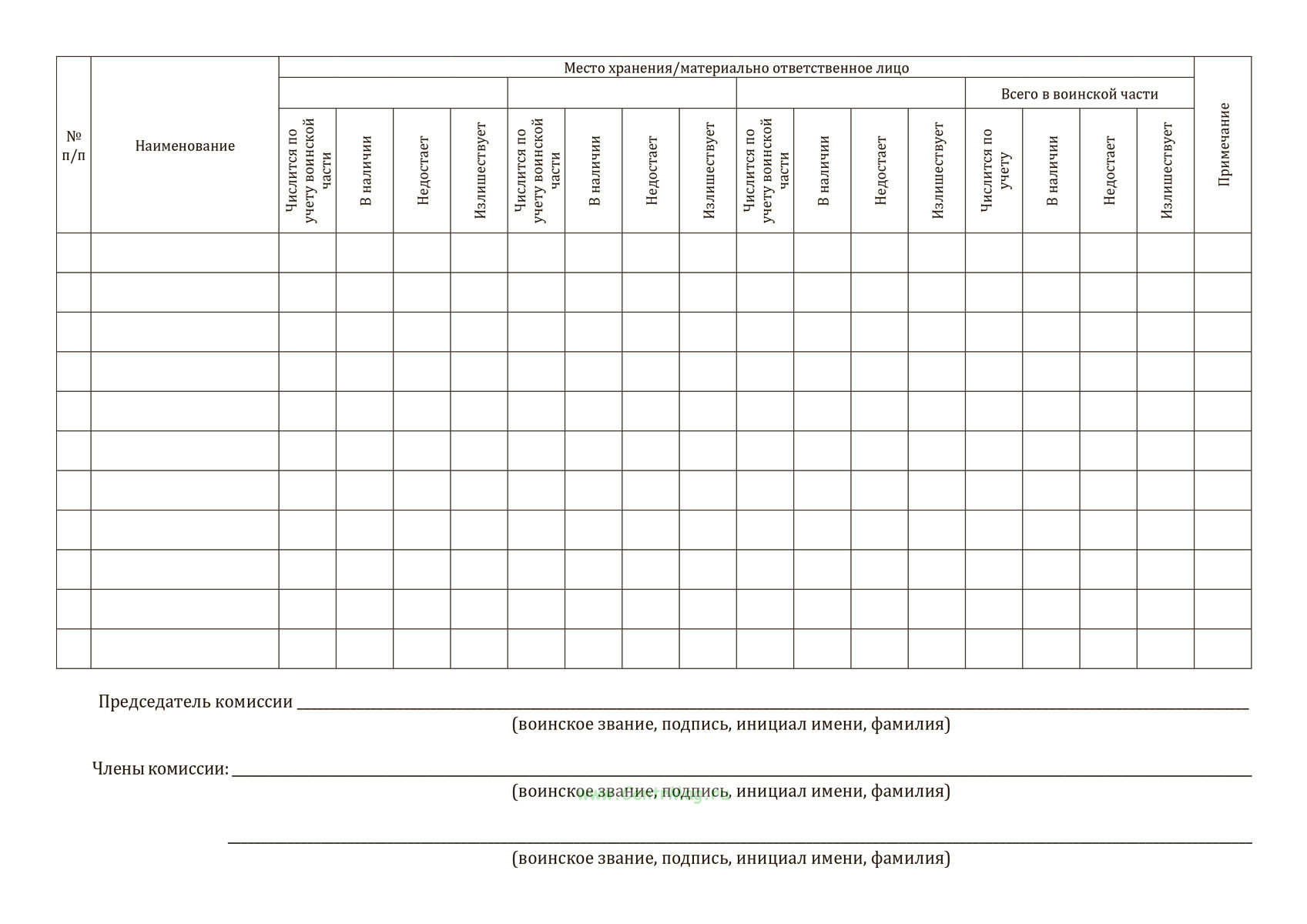 По итогам проведения инвентаризации оружия и боеприпасов в воинской части председателем комиссии оформляется ведомость проверки наличия оружия и боеприпасов в местах их хранения, которая является приложением к акту инвентаризации.