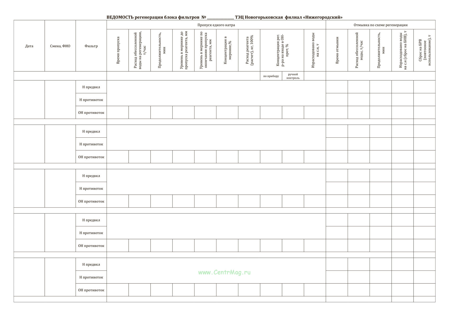 Ведомость регенерации блока фильтров применяется для поэтапной фиксации параметров проведения регенерации фильтров Н- и ОН-типа (катионитовых и анионитовых) на водоочистных установках. Она содержит данные о расходе воды и реагентов, времени процессов, концентрации растворов, уровнях в мерниках, а также об отмывке и сбросе. Документ обеспечивает контроль качества регенерации, учёт ресурсов и соблюдение технологического режима фильтрации.