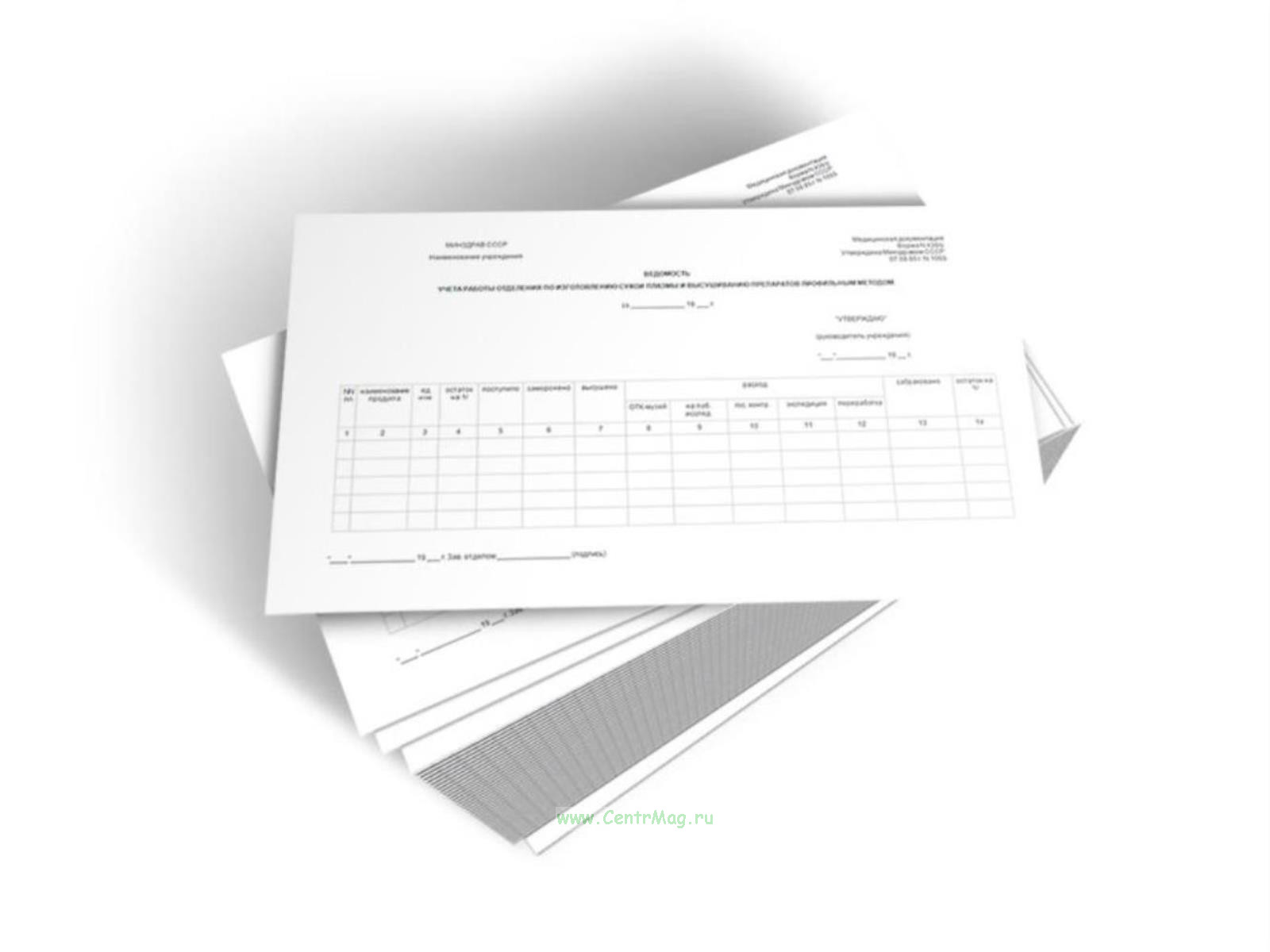 Форма ведомости учета работы отделения по изготовлению сухой плазмы и высушиванию препаратов лиофильным методом соответствует приложению 38 к Формам первичной медицинской документации для учреждений службы крови. Приказ №1055 от 07.08.1985 г., который утратил силу.