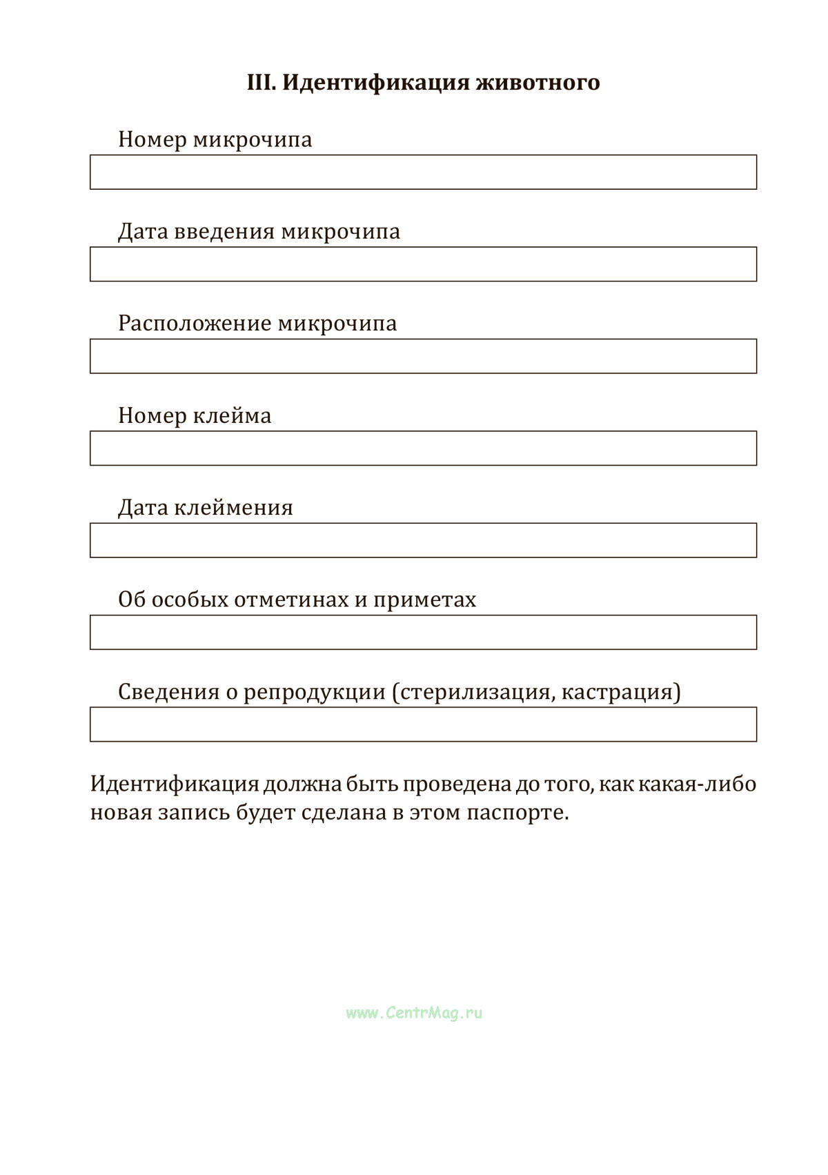 III. Идентификация животного