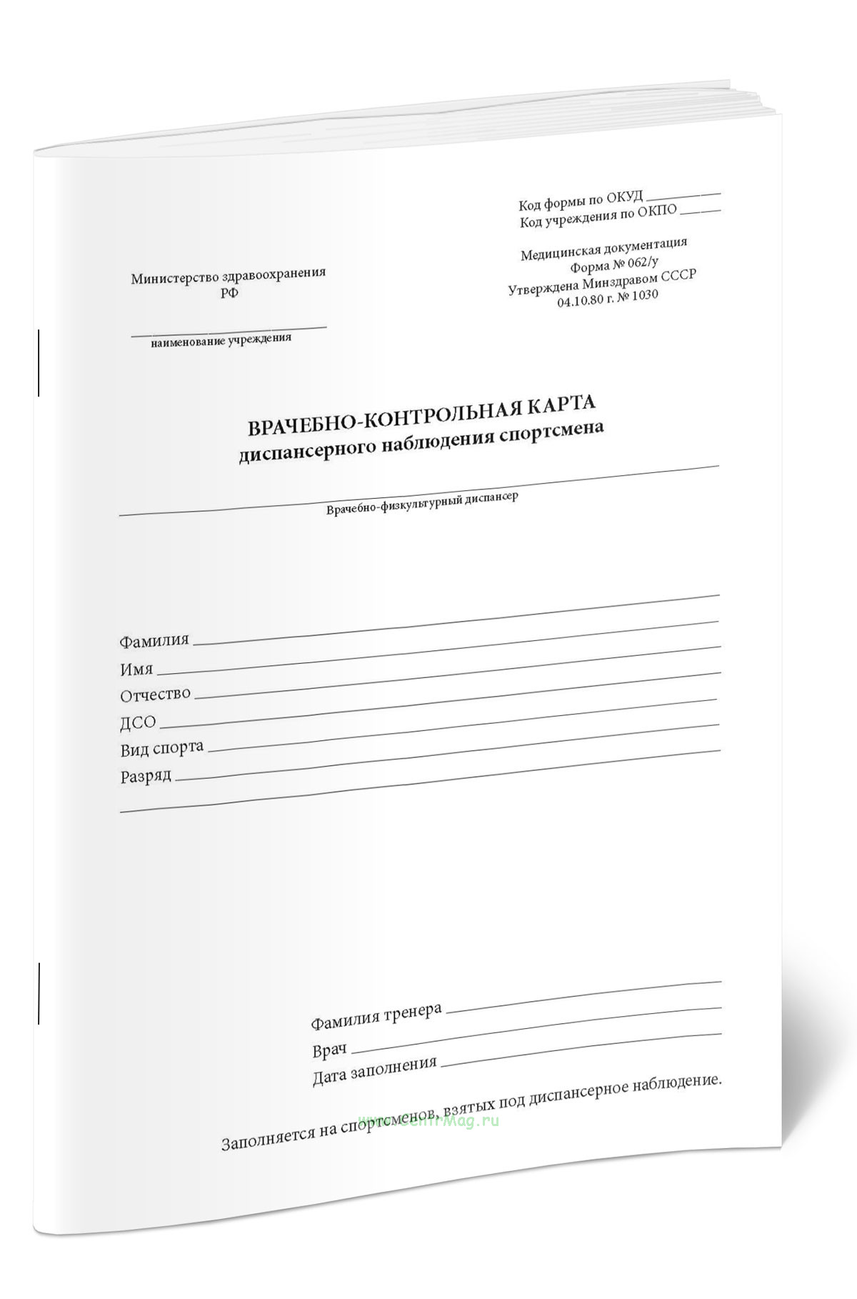 Форма Врачебно-контрольной карты диспансерного наблюдения спортсмена (Форма 062/у), утверждена Приказом Минздрава СССР №1030 «Об утверждении форм первичной медицинской документации учреждений здравоохранения» от 4 октября 1980 г., который утратил силу.