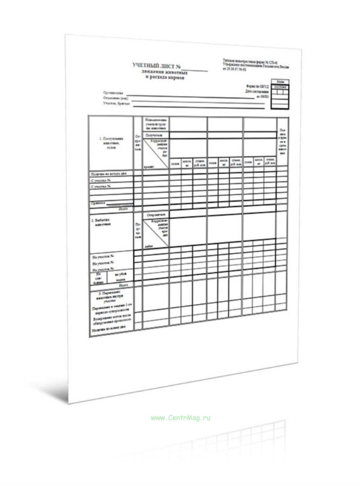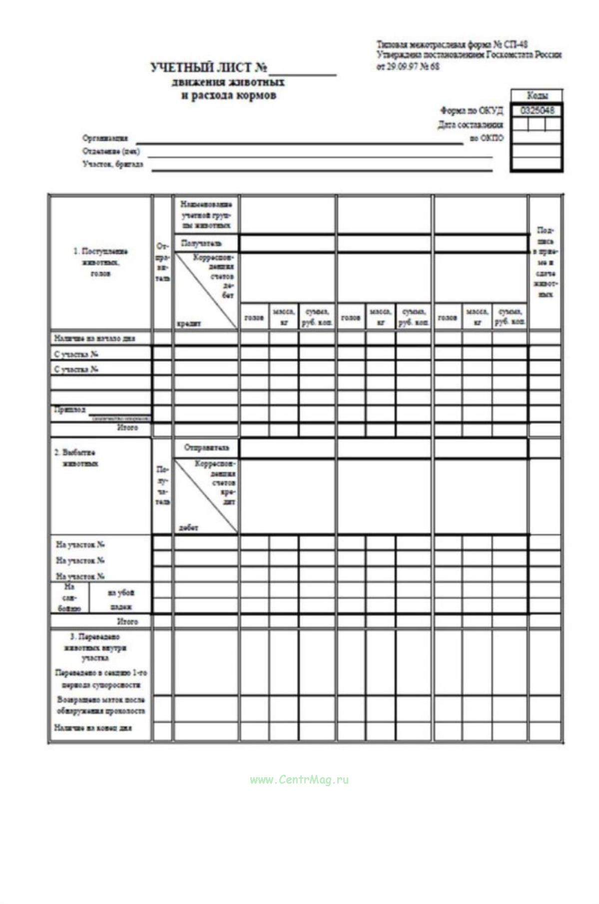 Бланк Учетного листа движения животных и расхода кормов (Форма №СП-48) соответствует Постановлению Госкомстата РФ от 29.09.1997 № 68 "Об утверждении унифицированных форм первичной учетной документации по учету сельскохозяйственной продукции и сырья"