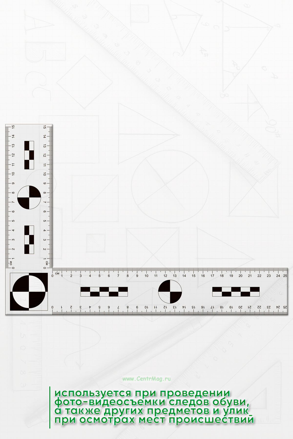 Линейка угловая используется при проведении фото-видеосъемки следов обуви, а также других предметов и улик при осмотрах мест происшествий