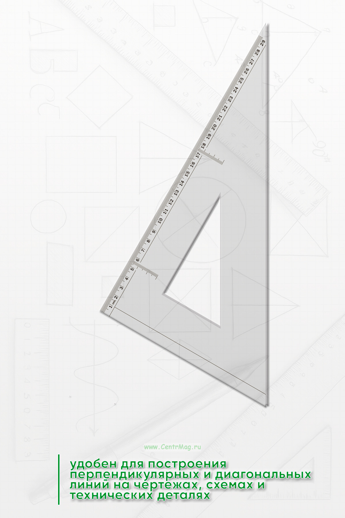 Удобен для построения перпендикулярных и диагональных линий на чертежах, схемах и технических деталях