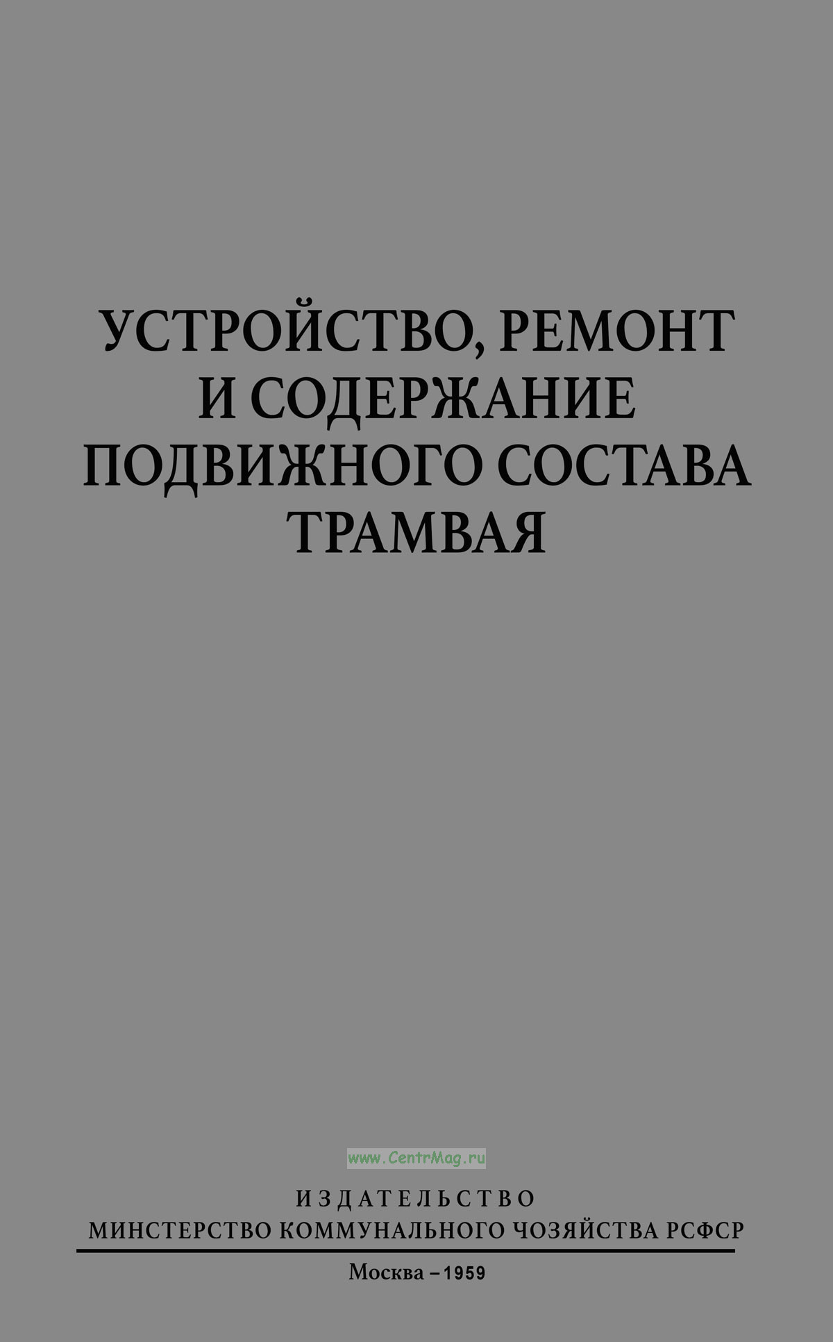 В книге приведены материалы по конструкции, ремонту и обслуживанию подвижного состава трамвая, основные требования технических условий, норм и допусков на ремонт и эксплуатацию трамвайных вагонов, а также краткие сведения по организации ремонта в трамвайных депо и мастерских.