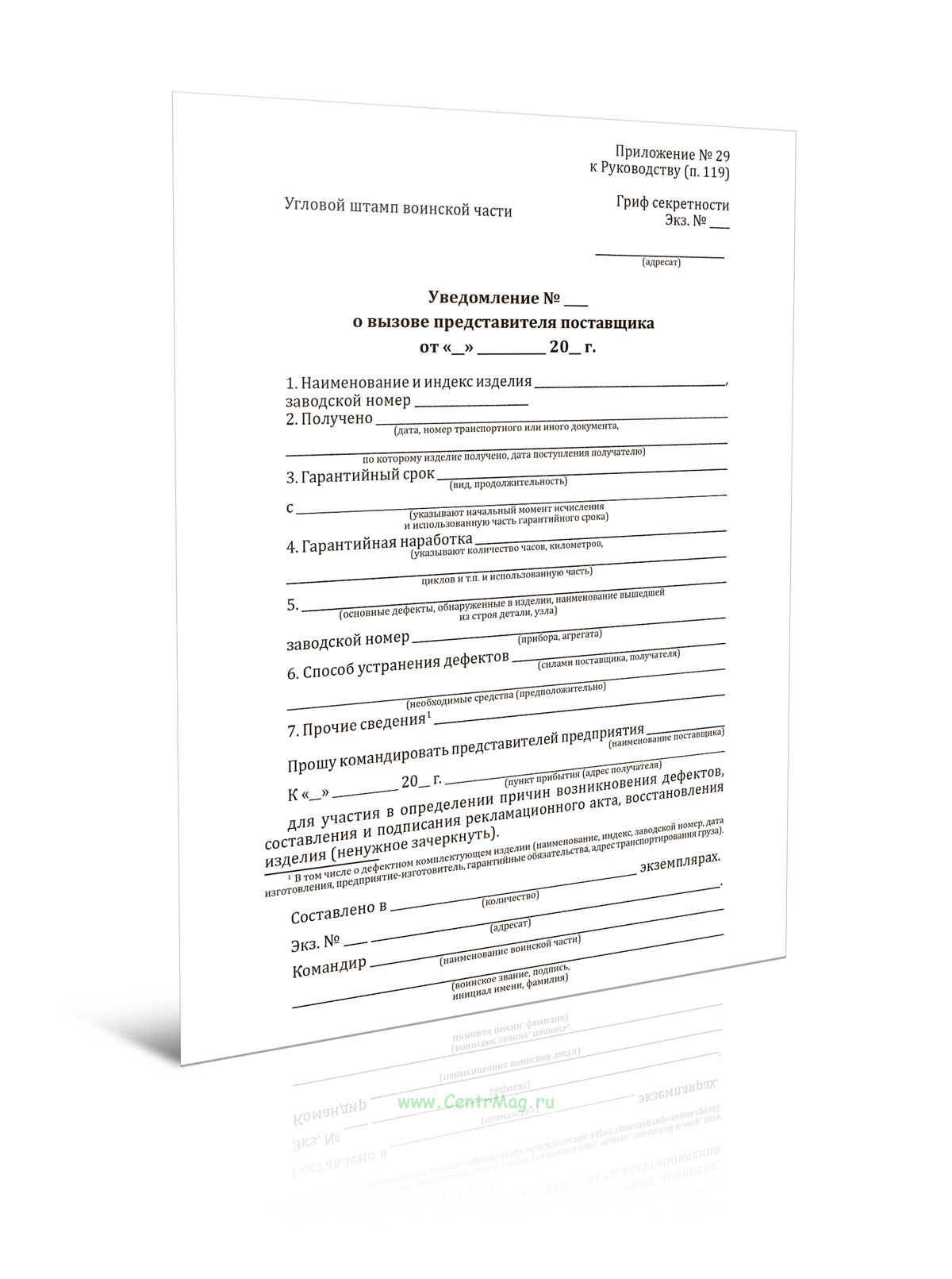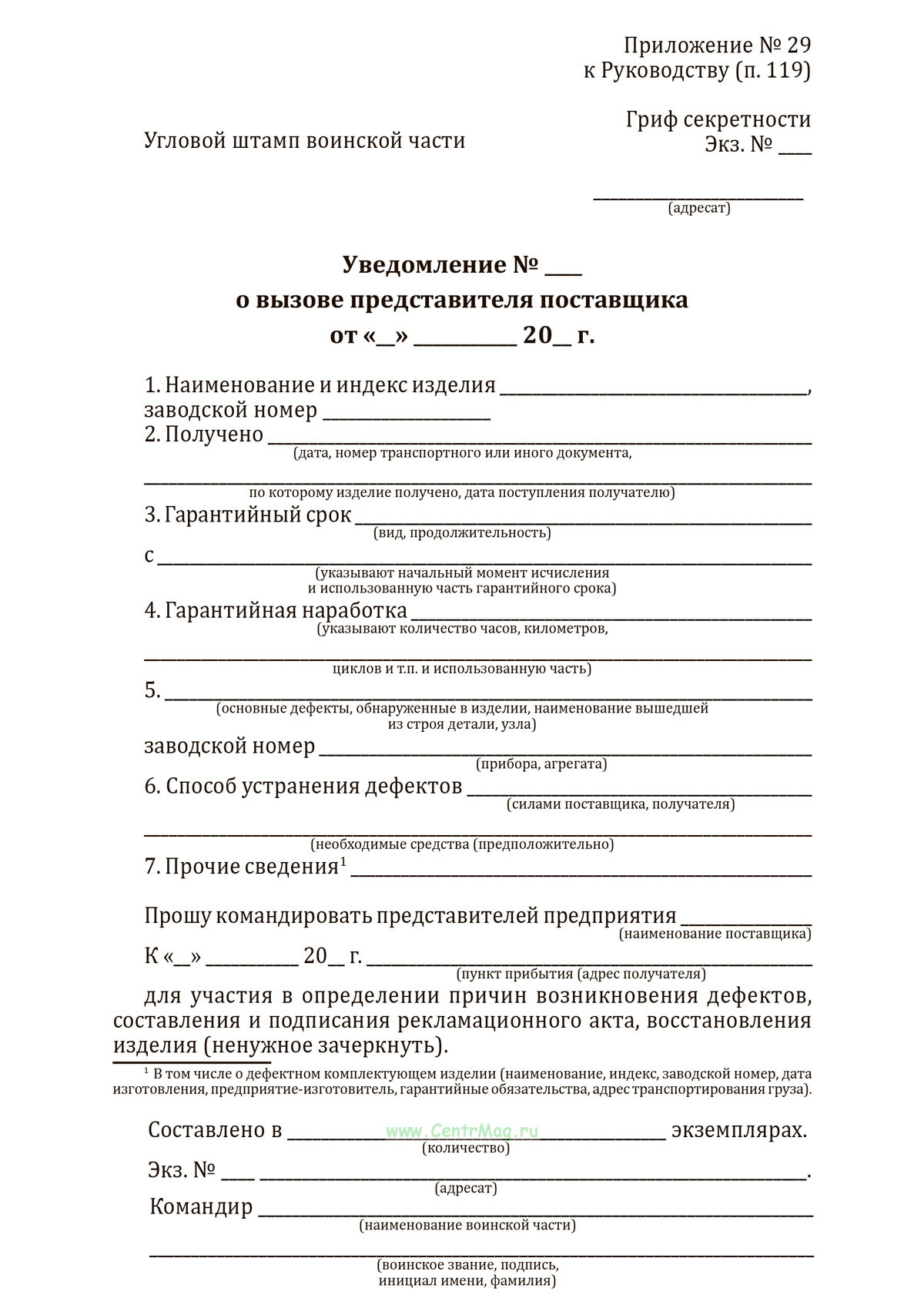 Форма Уведомления о вызове представителя поставщика соответствует Приложению № 29 Приказу Министра обороны РФ от 28.12.2013 N 969 "Об утверждении Руководства по содержанию вооружения и военной техники общевойскового назначения, военно-технического имущества в Вооруженных Силах Российской Федерации"