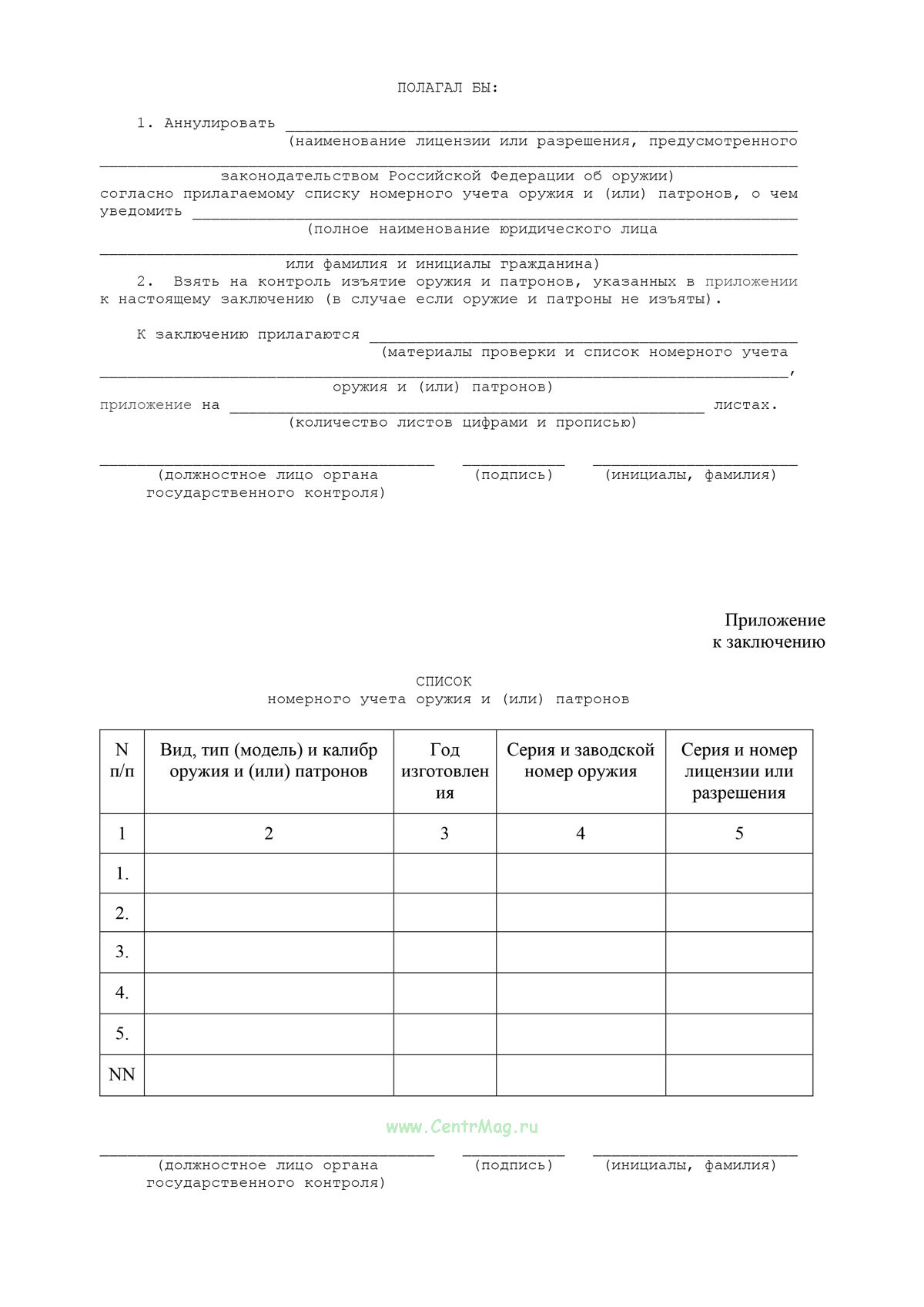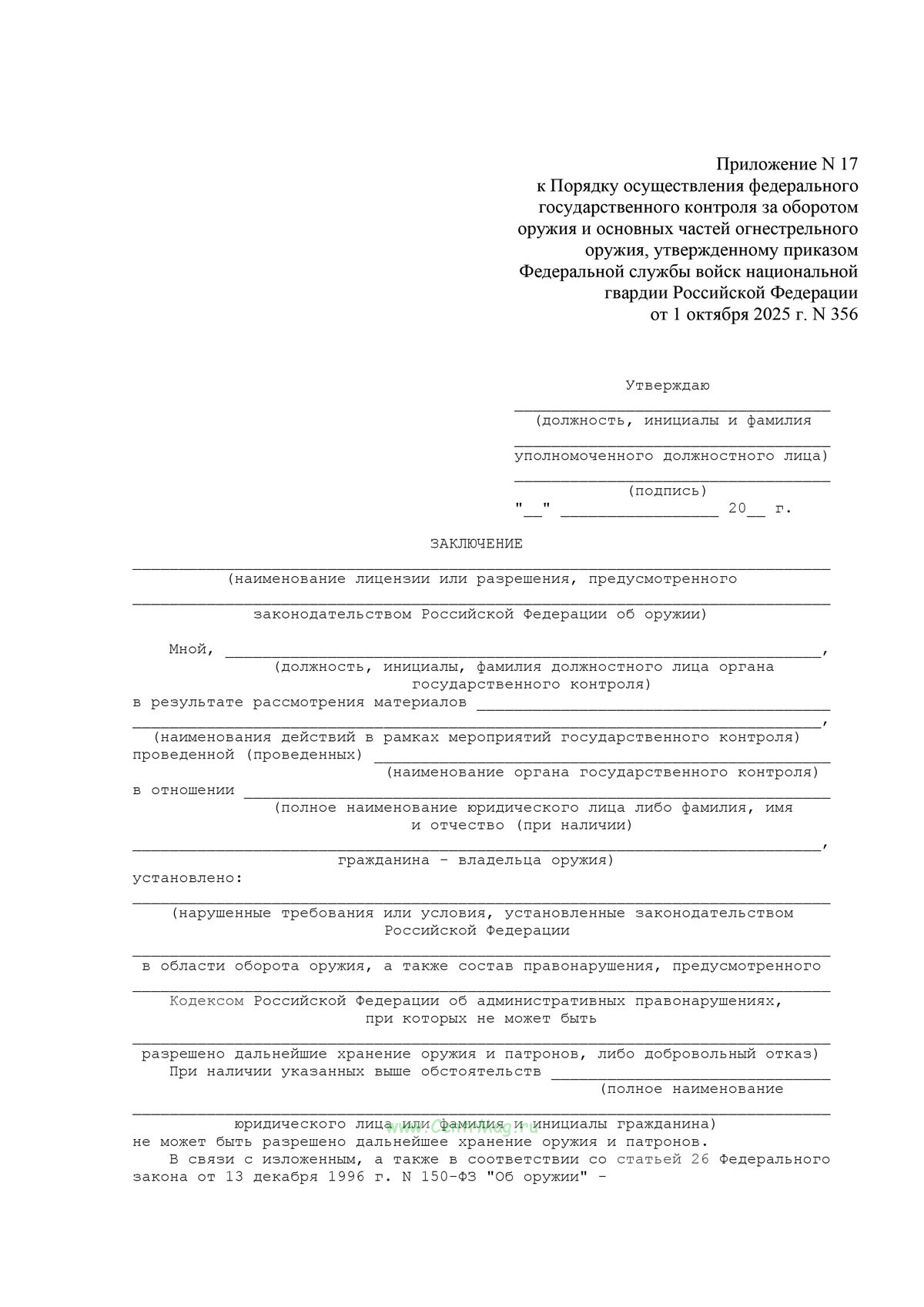 Форма Заключения соответствует Приложению 17 к Приказу Росгвардии от 01.10.2025 N 356 "Об утверждении Порядка осуществления федерального государственного контроля за оборотом оружия и основных частей огнестрельного оружия"