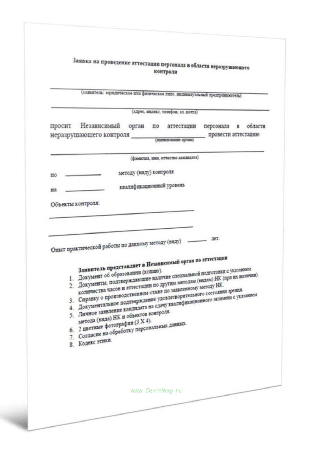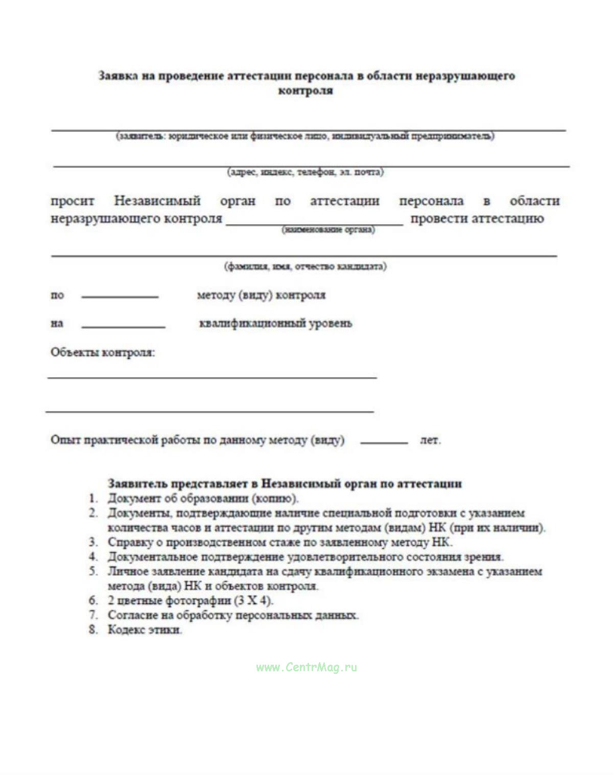Заявка на проведение аттестации персонала в области неразрушающего контроля