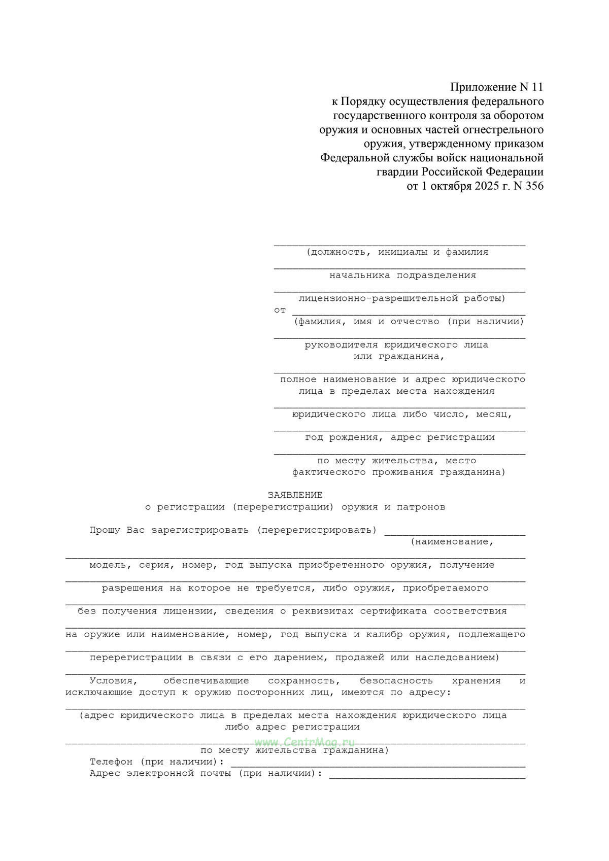 Форма Заявления о регистрации (перерегистрации) оружия и патронов соответствует Приложению 11 к Приказу Росгвардии от 01.10.2025 N 356 "Об утверждении Порядка осуществления федерального государственного контроля за оборотом оружия и основных частей огнестрельного оружия"