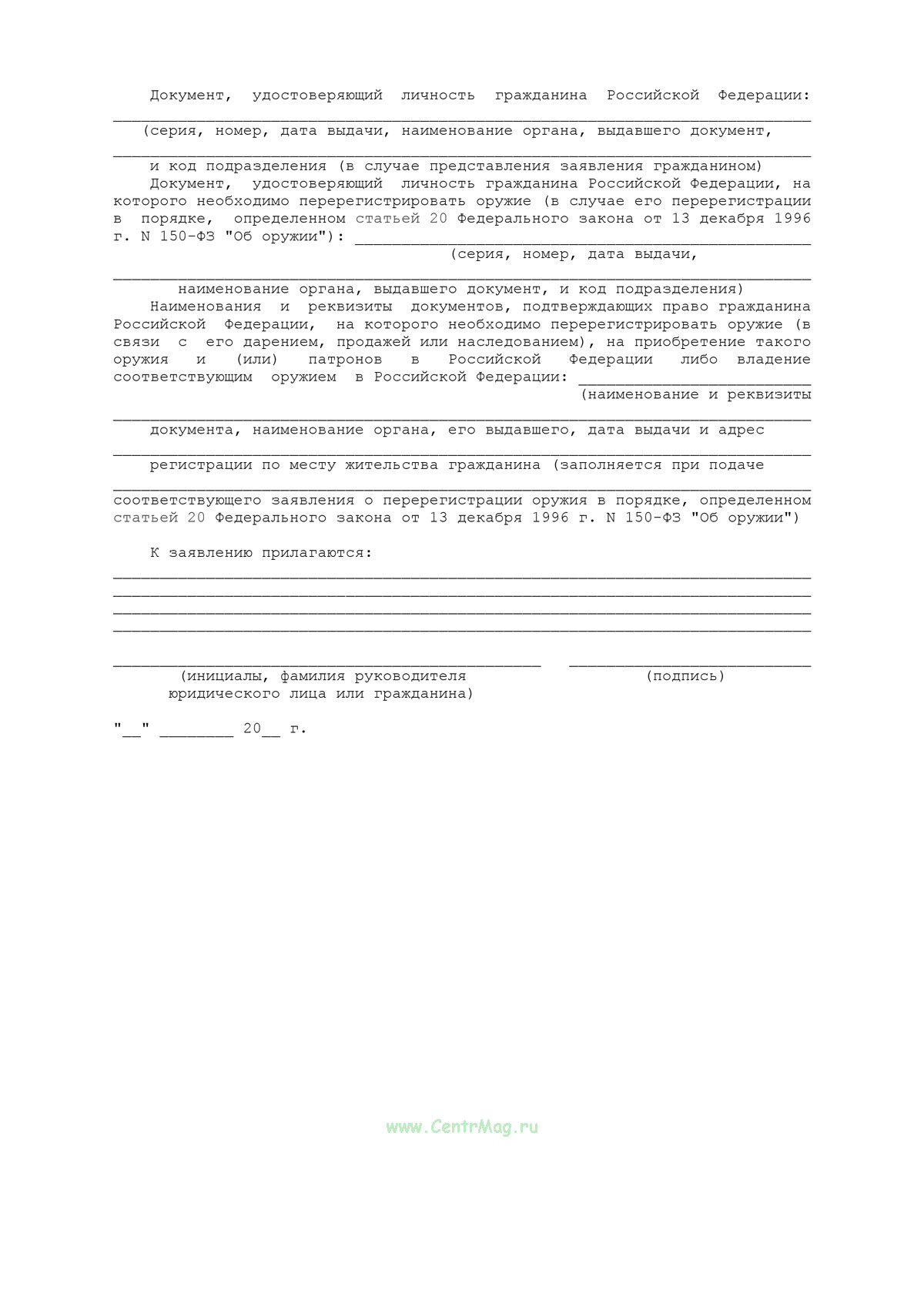 Заявление о регистрации (перерегистрации) оружия и патронов продается только как чистый незаполненный бланк, без печатей и подписей соответствует 149-ФЗ от 27.07.2006