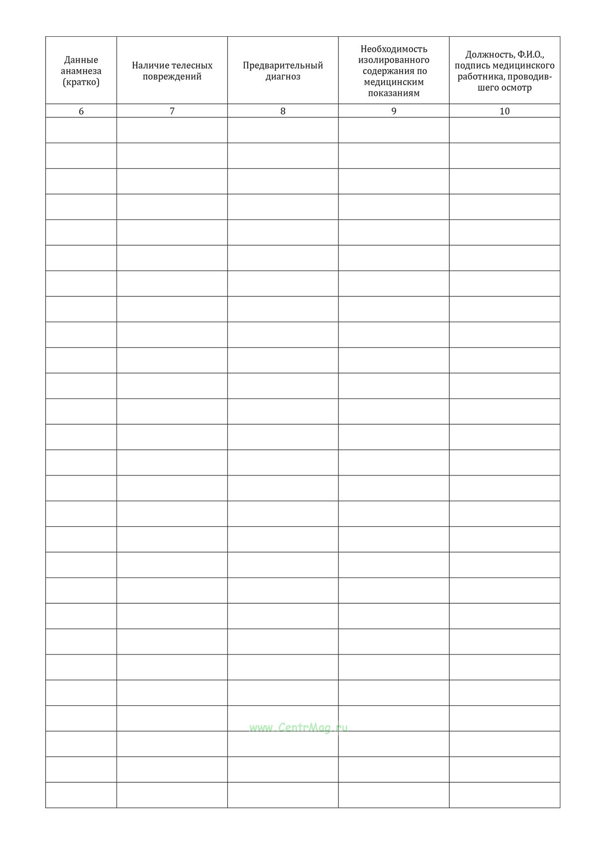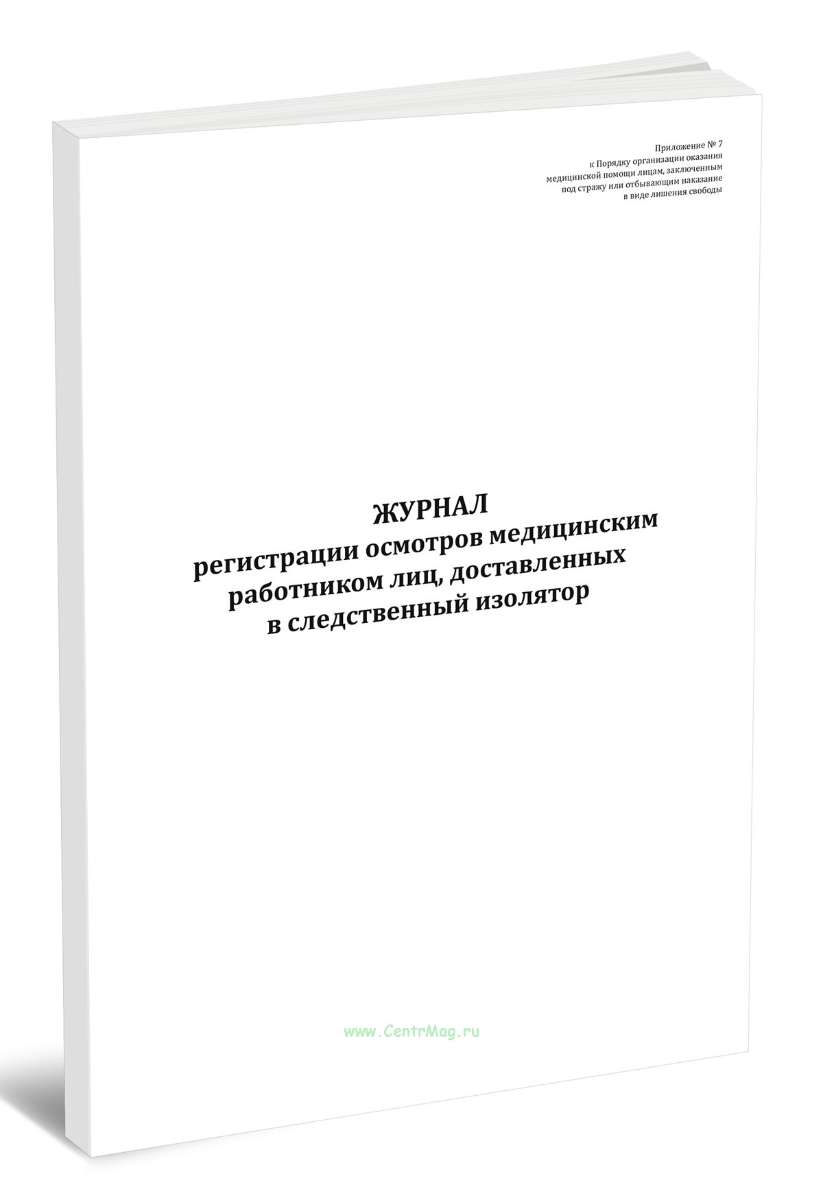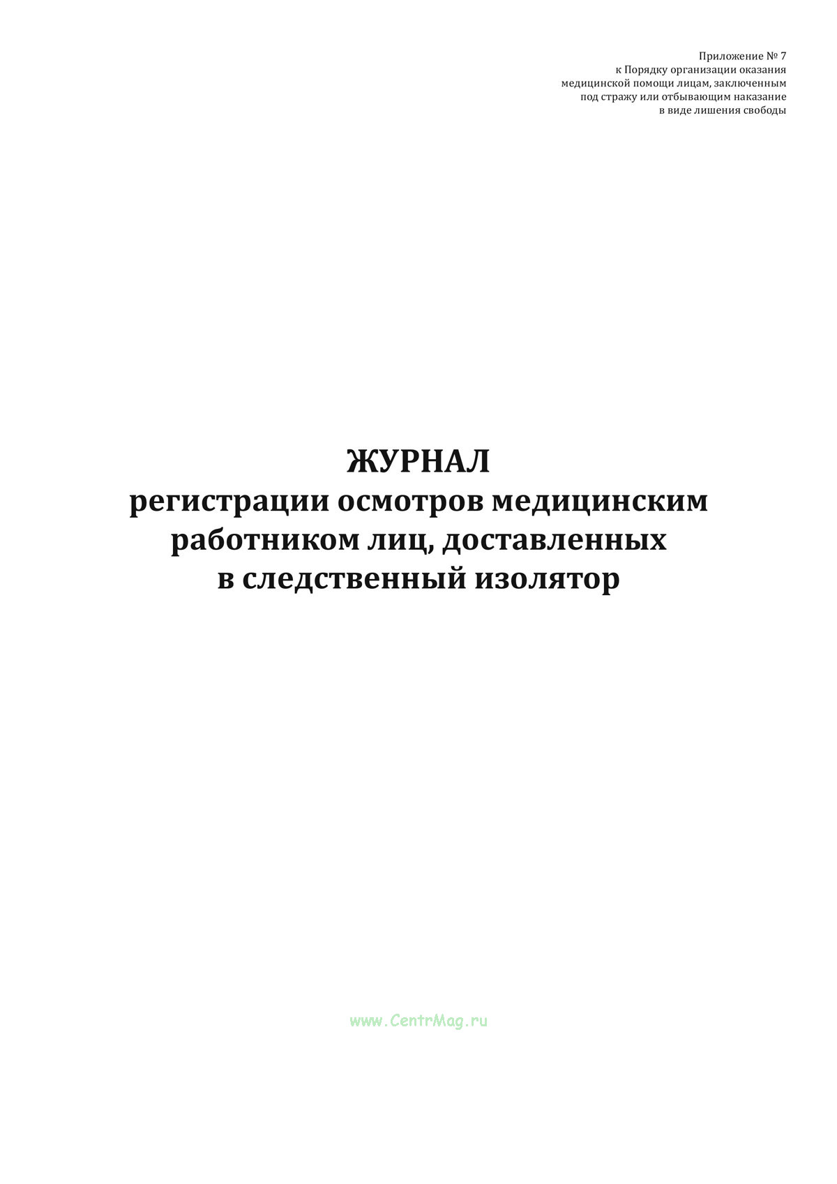 Форма журнала регистрации осмотров медицинским работником лиц, доставленных в следственный изолятор соответствует Приложению №7 к Приказу Минюста России от 28.12.2017 N 285 "Об утверждении Порядка организации оказания медицинской помощи лицам, заключенным под стражу или отбывающим наказание в виде лишения свободы"