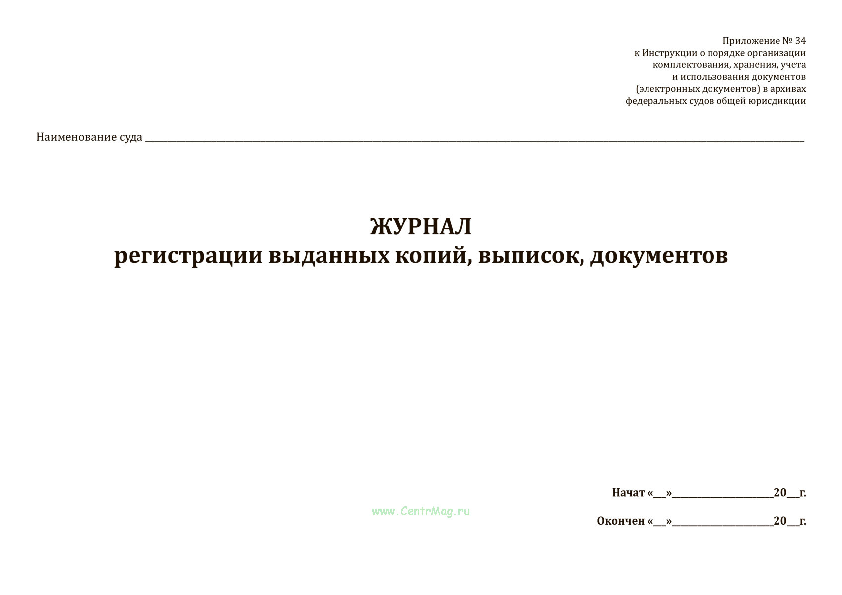 Форма журнала регистрации выданных копий, выписок, документов соответствует Приложению 34 к "Инструкции о порядке организации комплектования, хранения, учета и использования документов (электронных документов) в архивах федеральных судов общей юрисдикции".