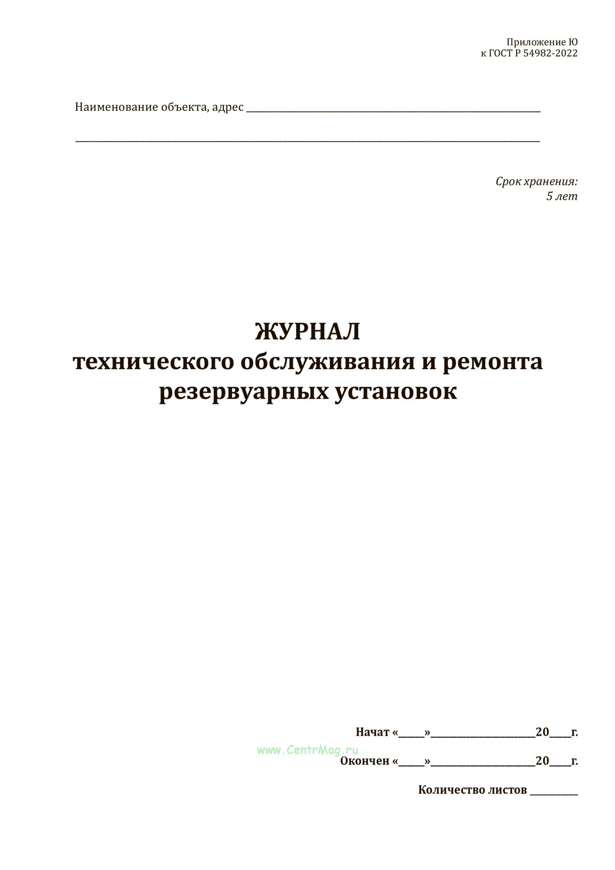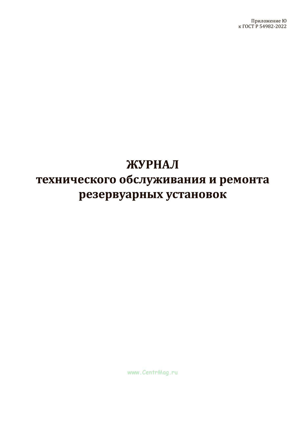 Форма Журнала технического обслуживания и ремонта резервуарных установок соответствует Приложению Ю к Приказу Росстандарта от 04.02.2022 N 59-ст "ГОСТ Р 54982-2022. Национальный стандарт Российской Федерации. Системы газораспределительные. Объекты сжиженных углеводородных газов. Общие требования к эксплуатации".