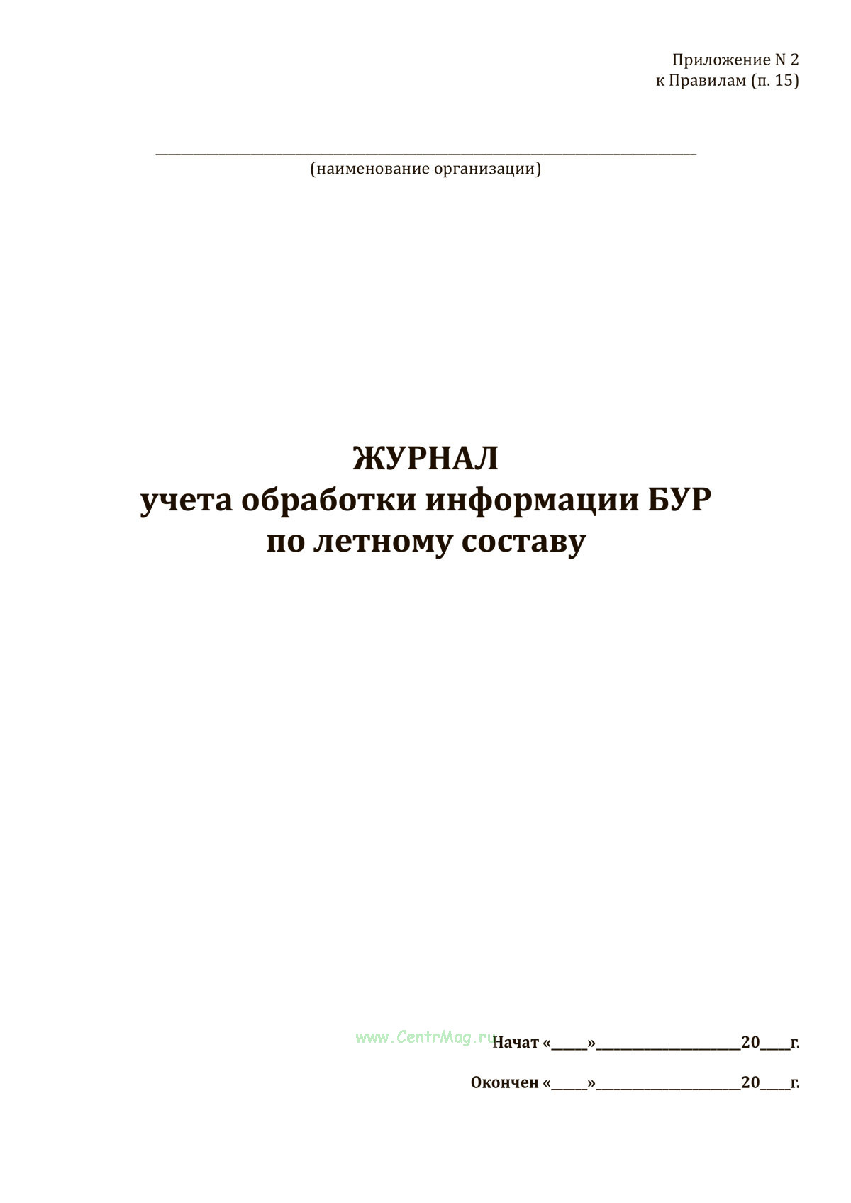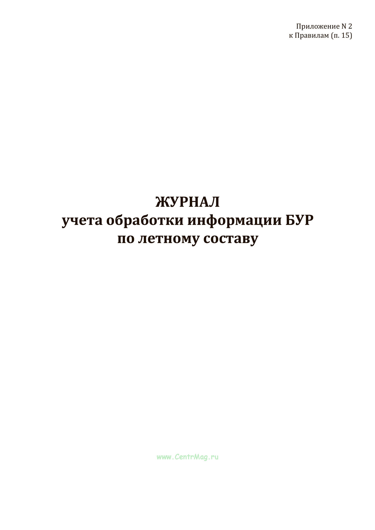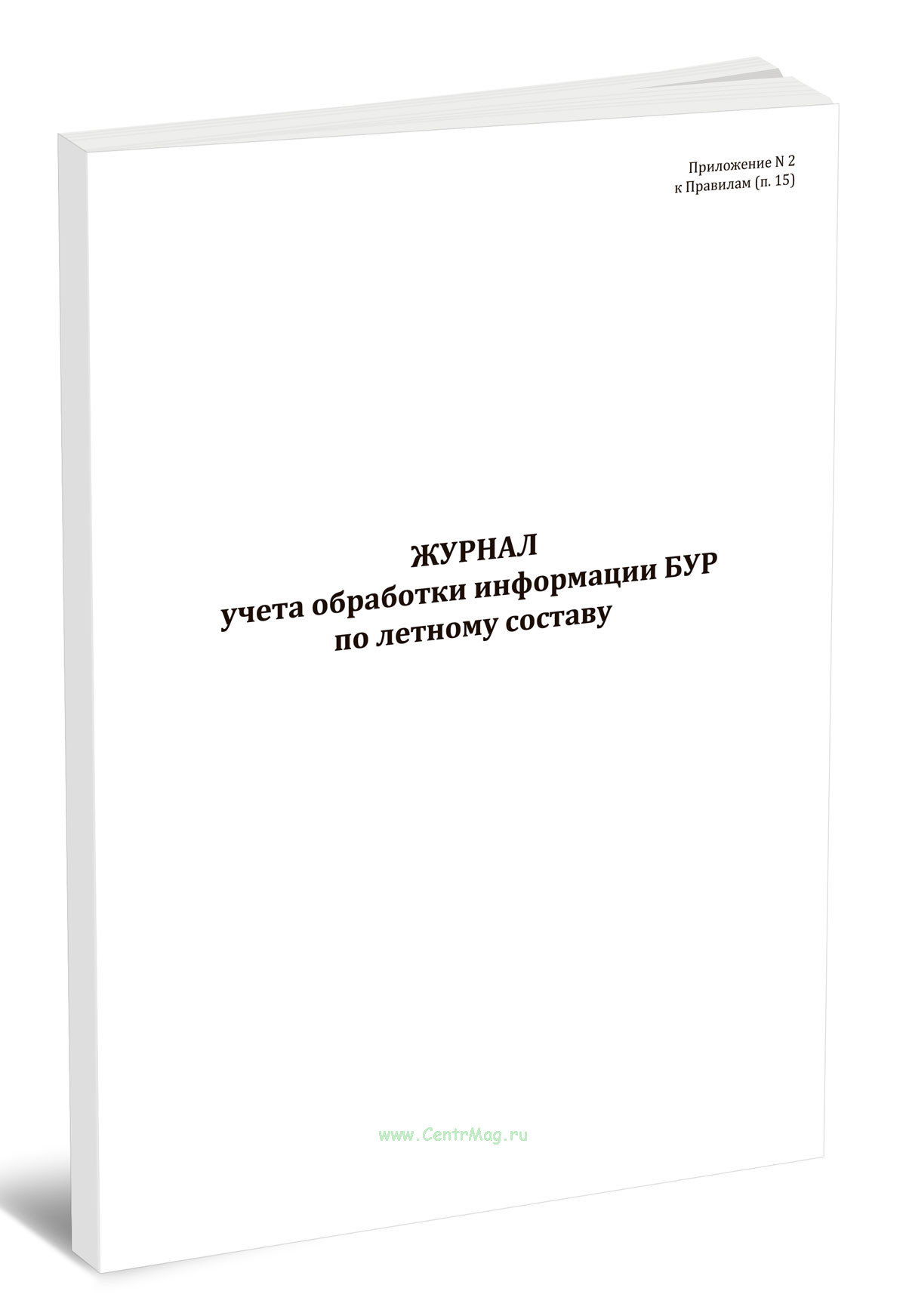 Форма Журнала учета обработки информации БУР по летному составу соответствует Приложение N 2 к Приказу Министра обороны РФ от 17.10.2001 N 420 "Об утверждении Федеральных авиационных правил по организации объективного контроля в государственной авиации".