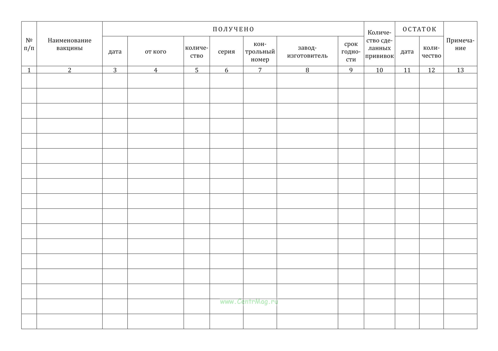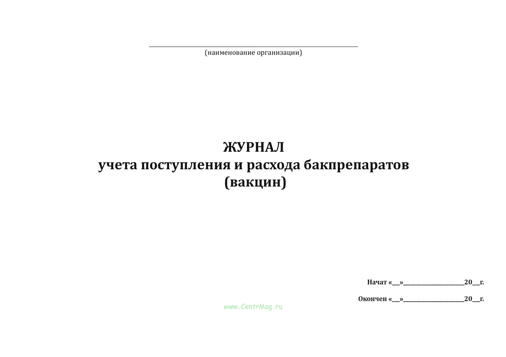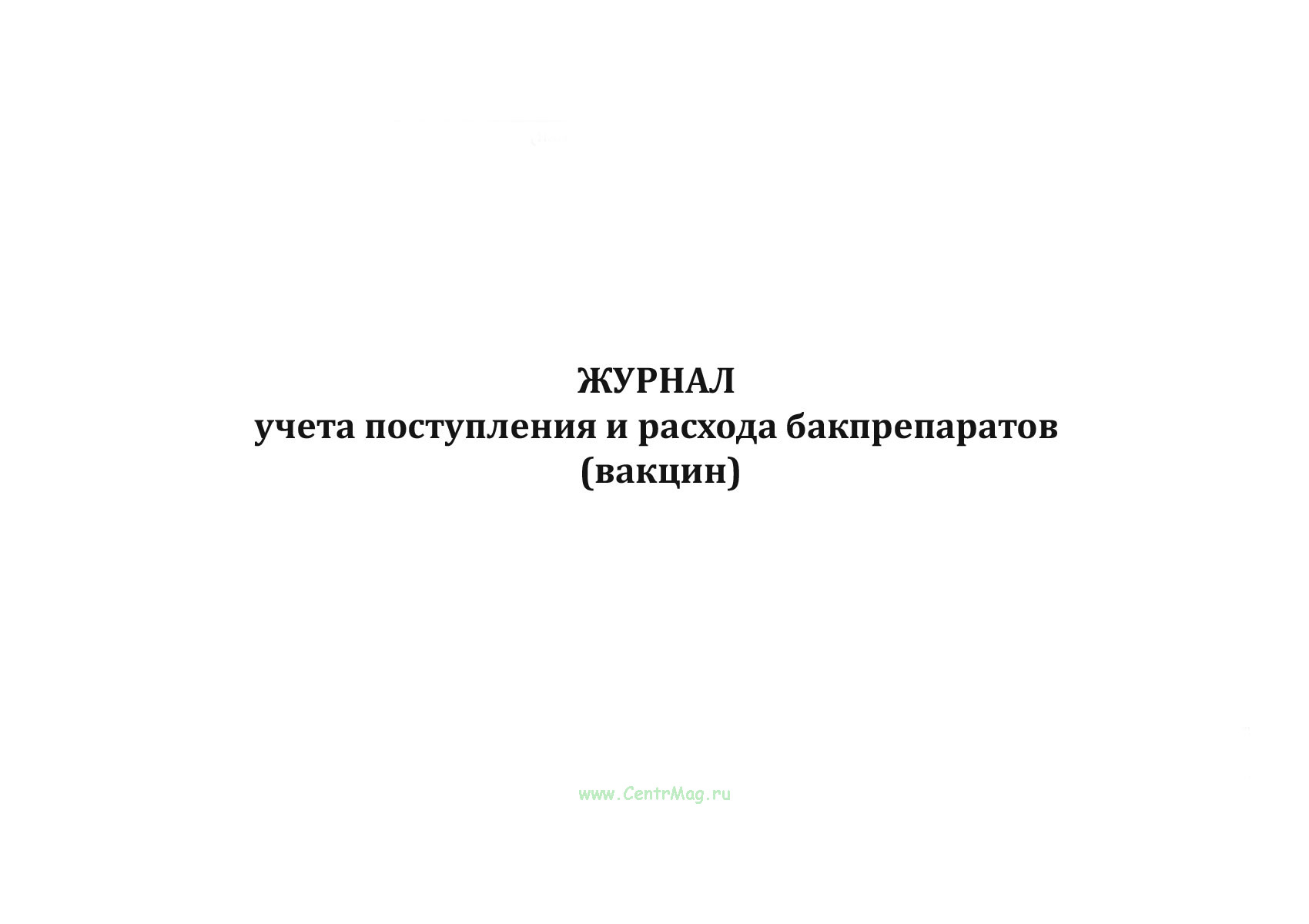Журнал учета поступления и расхода бакпрепаратов (вакцин) - предназначен для регистрации поступления, движения и остатков вакцин и бакпрепаратов в мед- и ветучреждениях, лабораториях, пунктах вакцинации, аптечных и складских подразделениях. Подходит главным/старшим медсестрам, зав. аптекой (складом) и материально-ответственным лицам, а также врачам-эпидемиологам, провизорам, лаборантам; используется в ветклиниках и прививочных кабинетах как государственных, так и частных организаций.