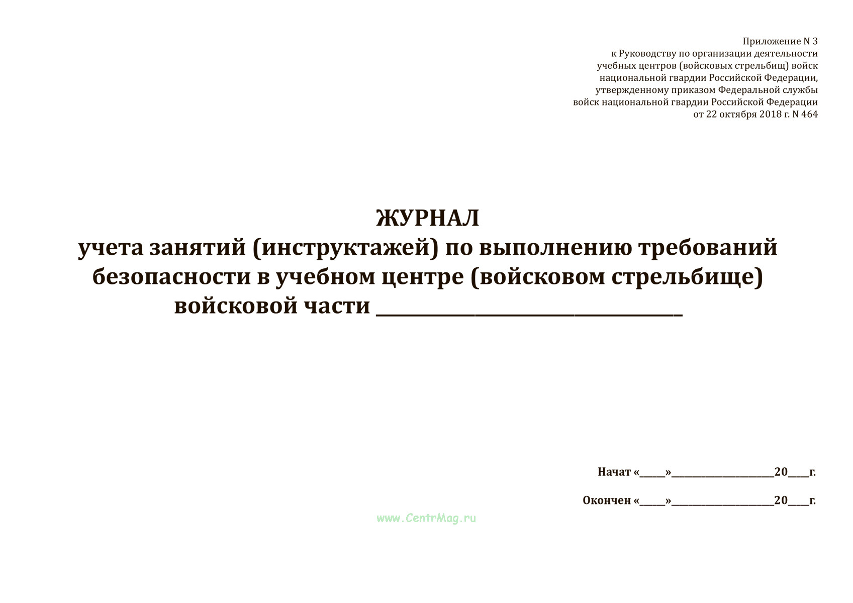 Форма Журнала учета занятий (инструктажей) по выполнению требований безопасности в учебном центре (войсковом стрельбище) войсковой части соответствует Приложению N 3 к Приказу Росгвардии от 22.10.2018 N 464 "Об утверждении Требований к оборудованию и эксплуатации учебных центров (войсковых стрельбищ) войск национальной гвардии Российской Федерации и Руководства по организации деятельности учебных центров (войсковых стрельбищ) войск национальной гвардии Российской Федерации"