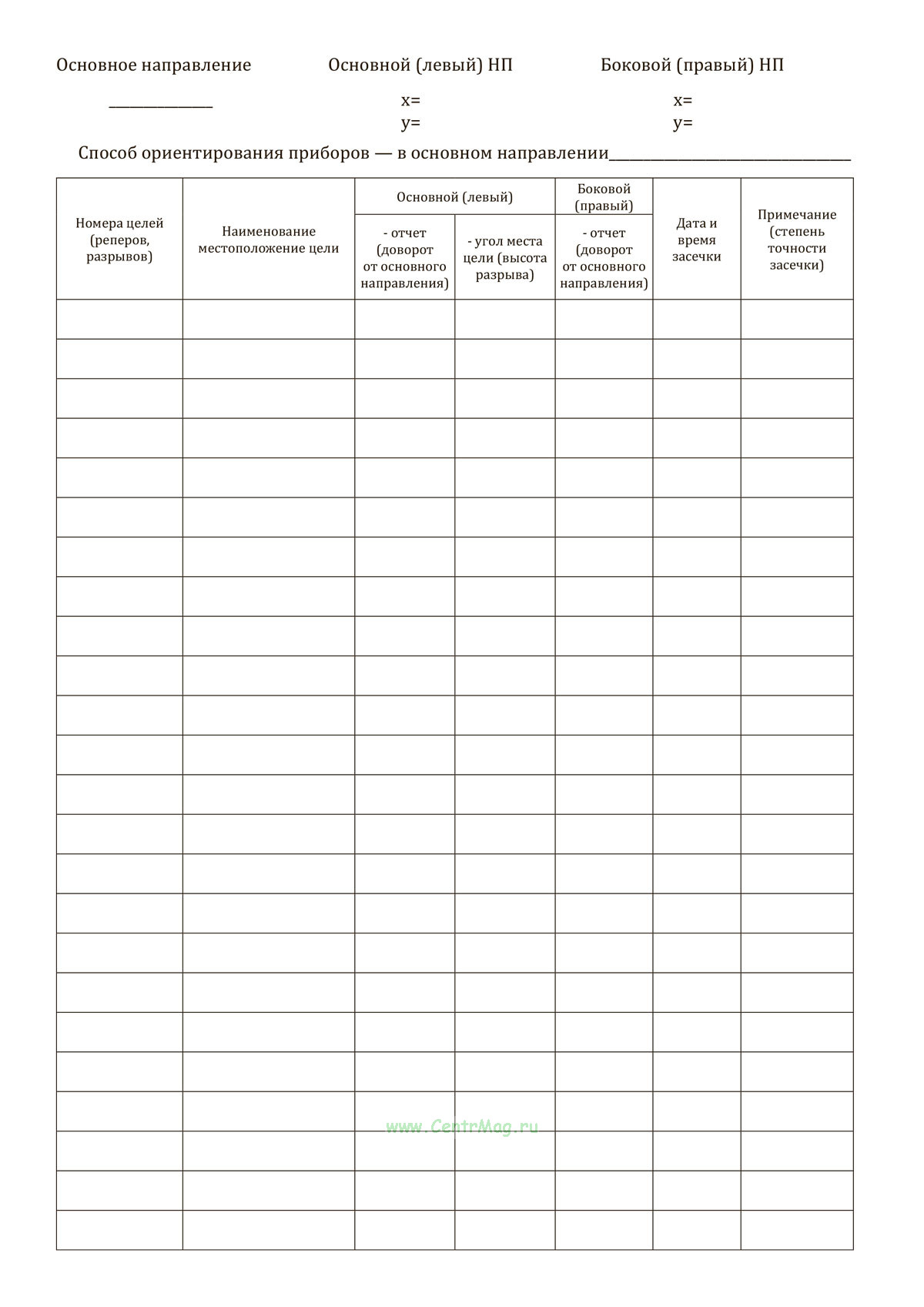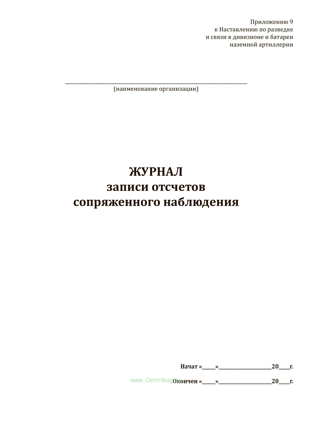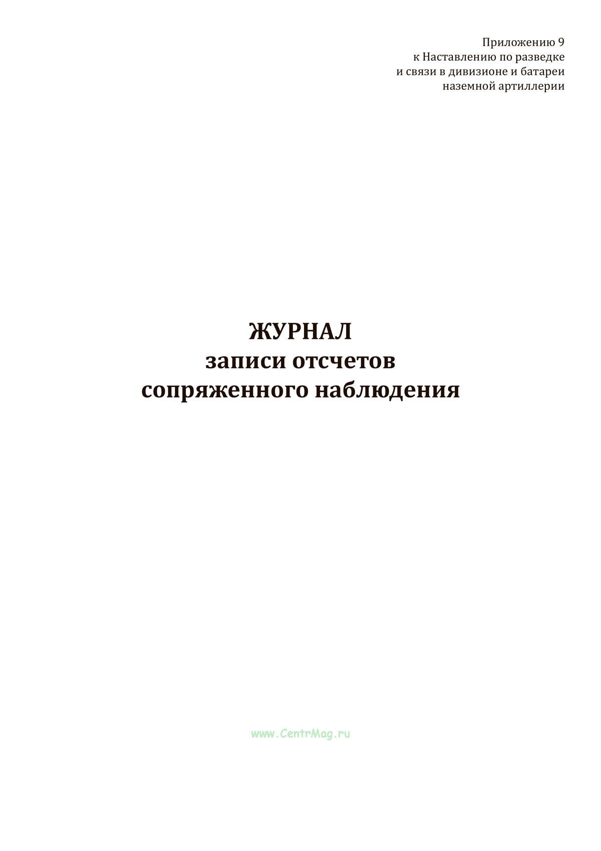 Форма Журнала записи отсчетов сопряженного наблюдения соответствует Приложению 9 к Наставлению по разведке и связи в дивизионе и батареи наземной артиллерии.