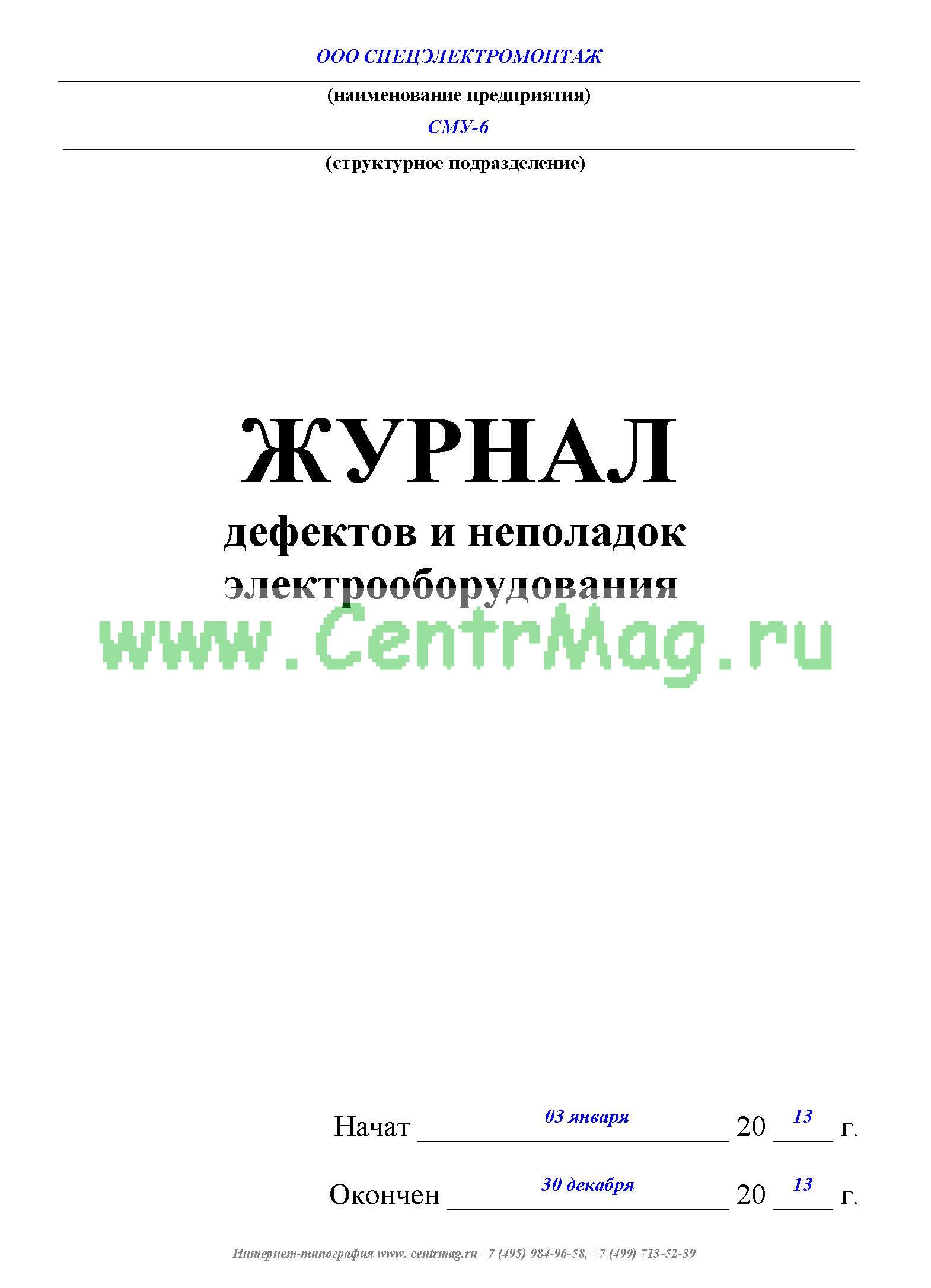 - журнал или картотека дефектов и неполадок на электрооборудовании;