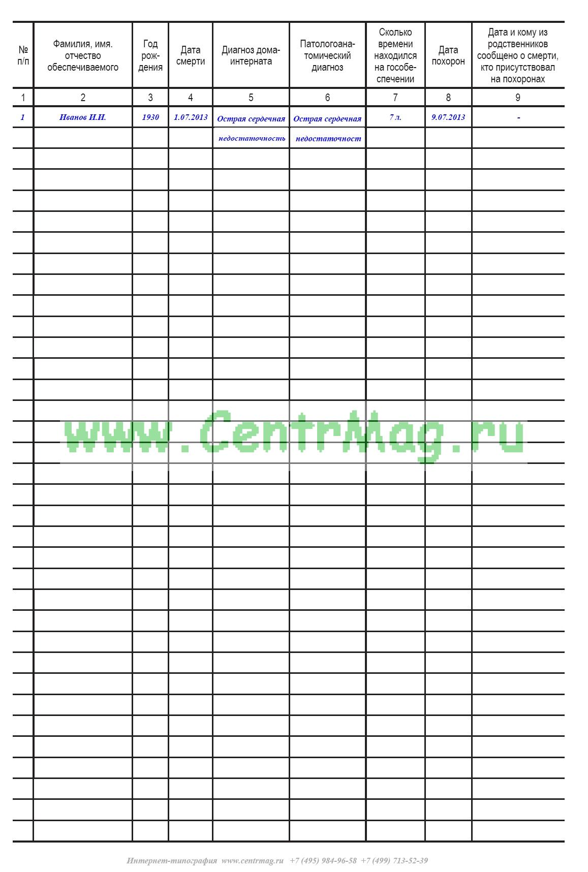 Учреждение в данном журнале ведет учет регистрации умерших, фиксируя в нем Ф.И.О, дату рождения и смерти, причину смерти, время нахождения на гособеспечении, уведомление родственников и дату похорон.