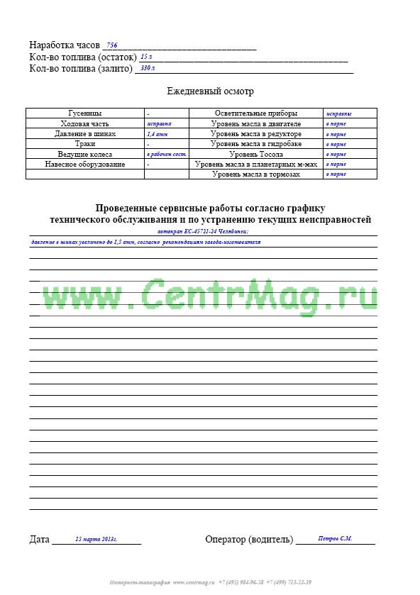 Образец и пример заполнения проведенных сервисных работ согласно графику технического обслуживания и по устранению текущих неисправностей