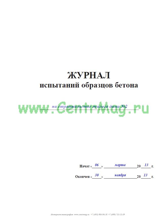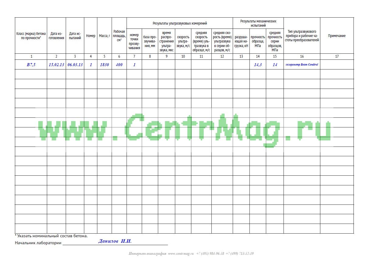 Для записи результатов испытаний образцов бетона используют журнал, в котором фиксируются класс (марка) бетона по прочности и результаты ультразвуковых измерений.