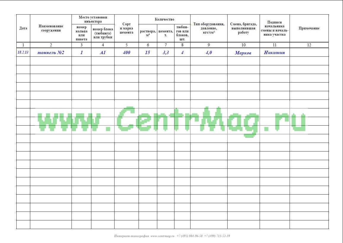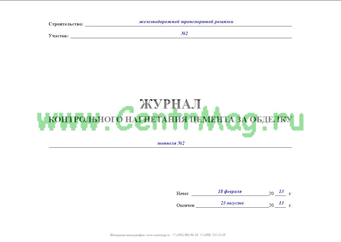 Форма журнала контрольного нагнетания цемента за обделку соответствует Приложению 7.2Д СП 32-105-2004. Метрополитены (одобрен Письмом Госстроя РФ от 23.03.2004 N ЛБ-1912/9).