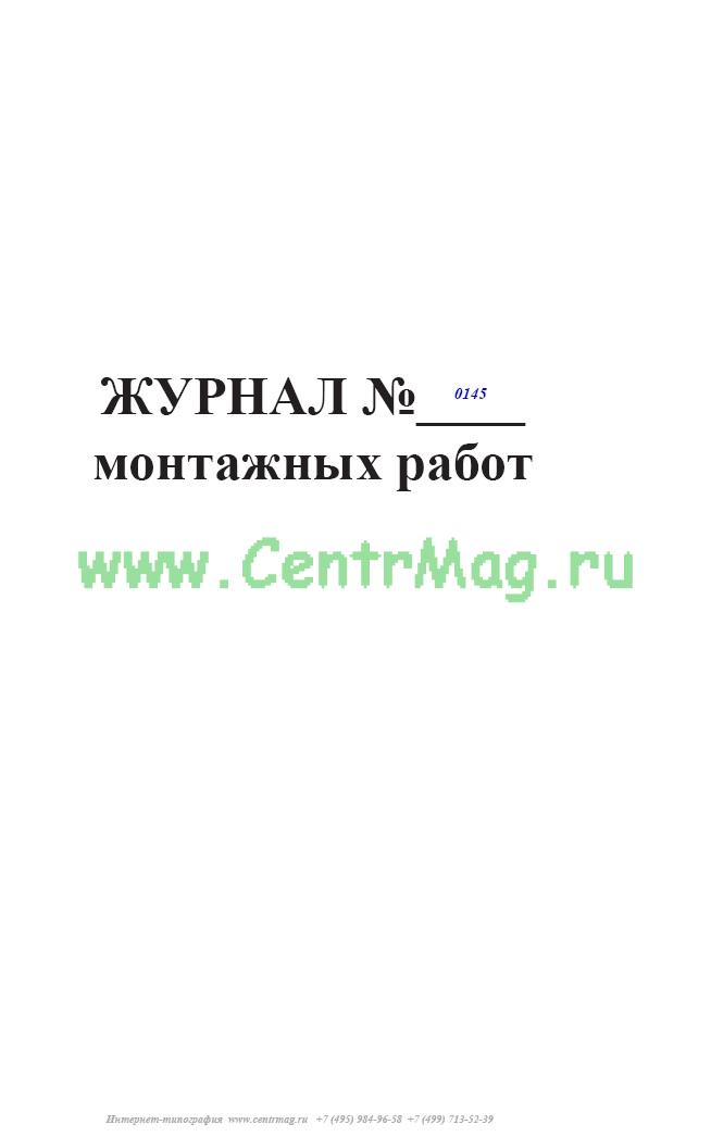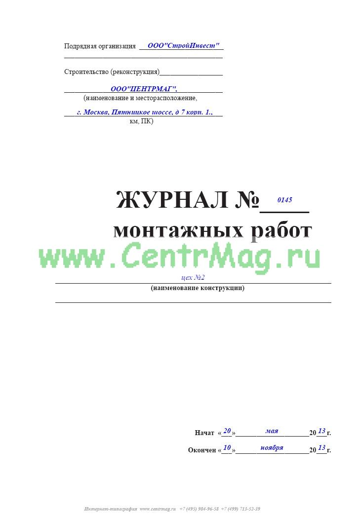 Журнал монтажных работ - это журнал установленной формы, на обложке или титульном листе которого указывают: наименование объекта, наименование конструкции, даты начала и окончания ведения журнала монтажных работ.
